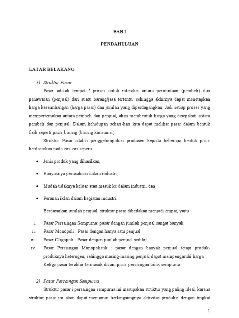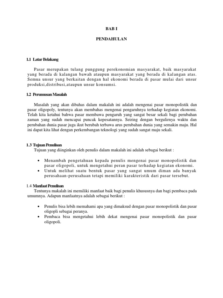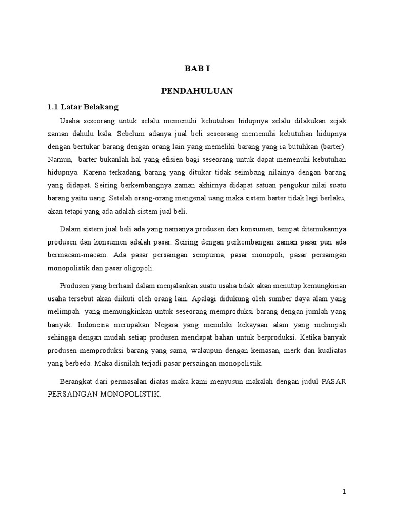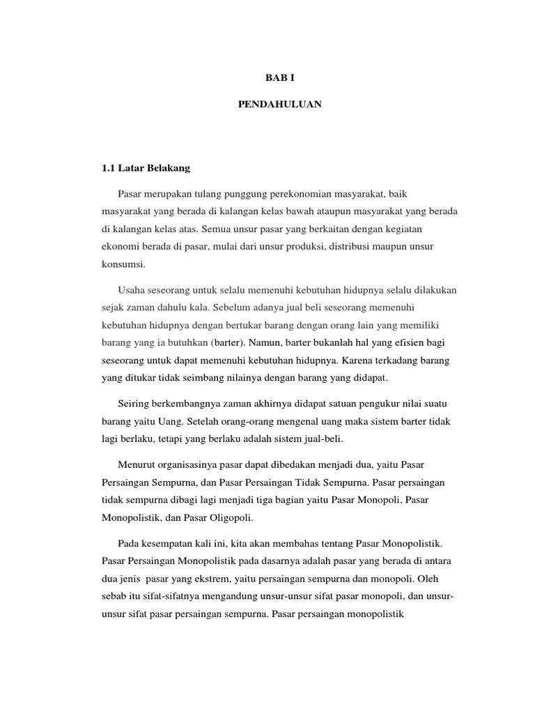 Bab i pendahuluan 1 1 latar belakang manusia hidup tidak lepas dari berbagai hal yang disebut kebutuan sehari hari. Berikut ini makalah ekonomi yang berjudul pasar persaingan monopolistik bagi yang menginginkan sudah dalam format ms word silahkan klik link dibawah ini. Bentuk pasar persaingan monopolistik adalah keadaan biasa yang ekstrim sebagian besar operasi operasi eceran berada dalam bentuk pasar ini bisnis bisnis kecil dari seluruh sektor jatuh dalam pasar kategori ini memulai suatu bisnis secara relatif adalah mudah tetapi untuk tetapbertahan dalam bisnis tersebut adalah tidak mudah.