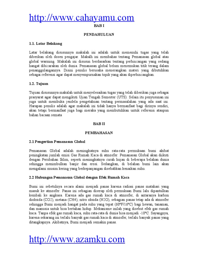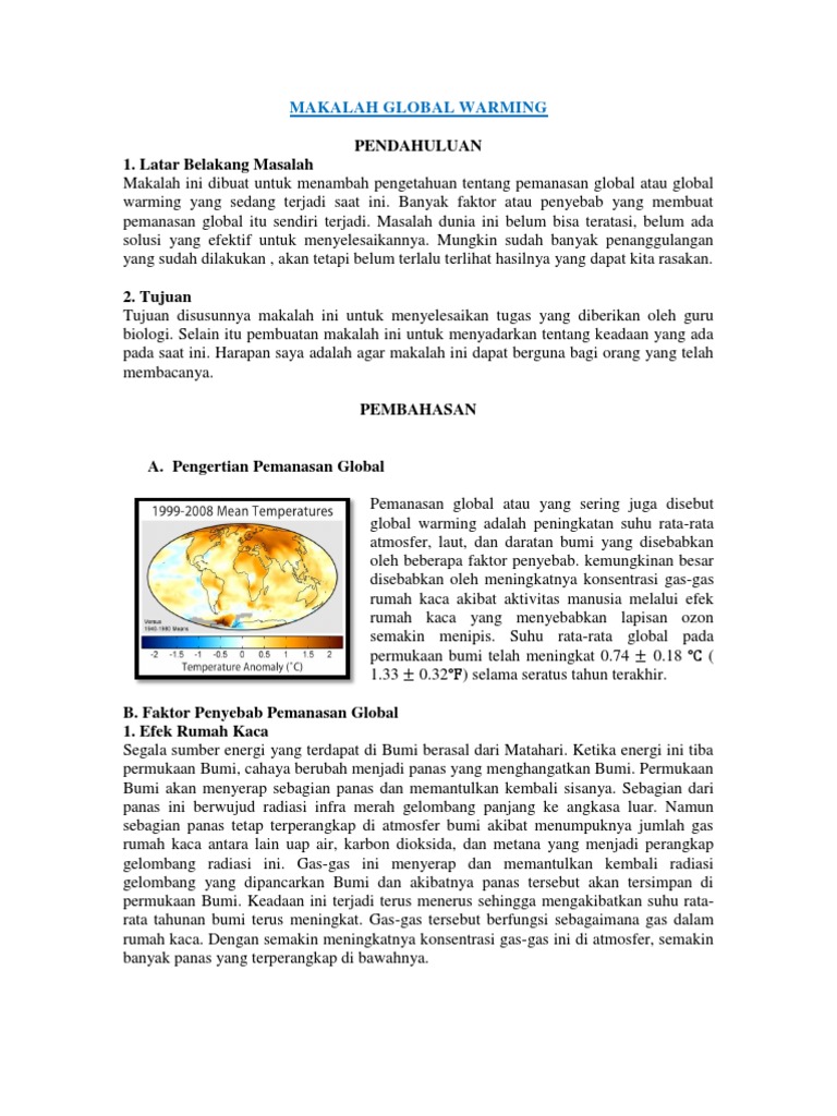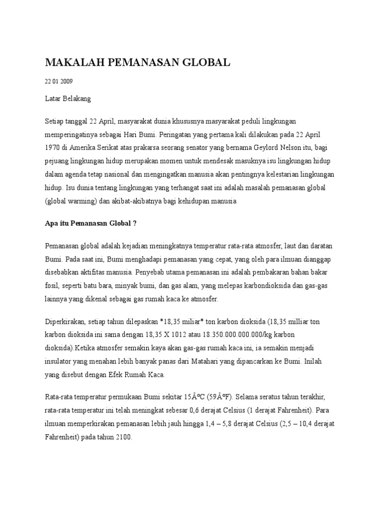 Pada tanggal 18 12 2001 berdasarkan penelitian yang telah dilakukan organisasi meteorologi dunia memperingatkan bahwa temperatur global mengalami peningkatan tiga kali lebih cepat dibandingkan dengan waktu waktu lalu. Makalah ini dibuat dalam rangka memenuhi tugas fisika kelas xi pada tahun ajaran 2015 2016 yang dapat menunjang kegiatan pembelajaran. Pemanasan global disebabkan oleh efek gas gas rumah kaca yang dihasilkan oleh aktifitas manusia.