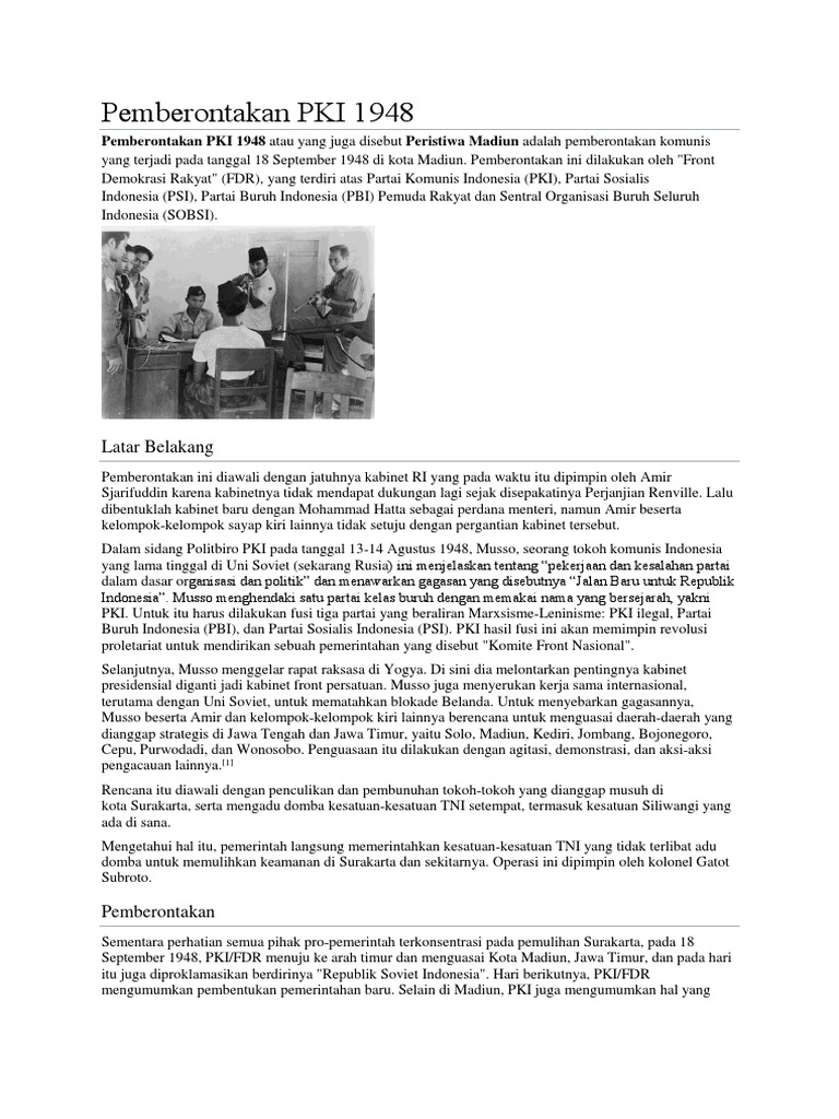 Dalam sejarahnya pki pernah berusaha melakukan pemberontakan melawan pemerintah kolonial belanda pada 1926 mendalangi pemberontakan pki madiun pada tahun 1948 serta dituduh membunuh 6 jenderal tni ad di jakarta pada tanggal 30 september 1965 yang di kenal dengan peristiwa g30s pki. Peristiwa pemberontakan pki di madiun tahun 1948 latar belakang tujuan upaya penumpasan kemerdekaan republik indonesia pada tanggal 17 agustus 1945 bukanlah suatu jaminan bahwa warga negara indonesia dapat merasakan kemerdekaan dengan seutuhnya seperti apa yang dijanjikan pada pembukaan undang undang dasar 1945. Pemberontakan pki madiun pemberontakan pki madiun ringkasan makalah tujuan penyebab musso tokoh kawakan komunis yang cukup lama bermukim di uni sovyet kembali ke indonesia bersama suprisno pada.