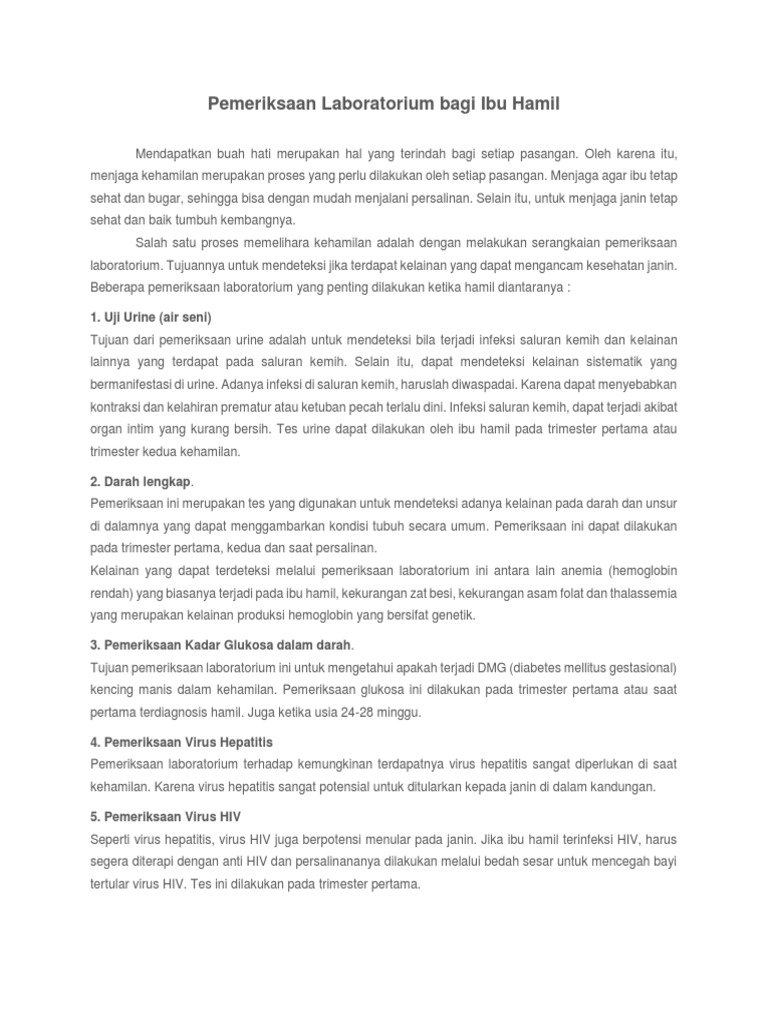 Makalah pemeriksaan laboratorium pada ibu hamil. Pemeriksaan laboratorium pada ibu hamil lainnya adalah dengan memeriksa hormon ibu hamil. Kadar beberapa zat terlarut dalam urin akan menjadi lebih pekat pada pagi hari sehingga lebih mudah diperiksa bila kadarnya rendah. Sapa ibu juga keluarga dan membuatnya merasa nyaman.
