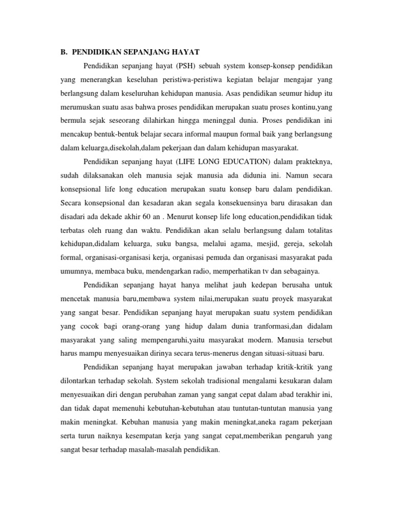 Makalah pendidikan sepanjang hayat. Melainkan juga diperlukan pendidikan informal dan nonformal. Makalah ini kami susun dengan tujuan memenuhi tugas dan mengetahui apa yang dimaksud dengan pendidikan sepanjang hayat dan situasi pendidikan. Pendidikan sepanjang hayat merupakan asas pendidikan yang cocok bagi orang orang yang hidup dalam dunia transformasi dan di dalam masyarakat yang saling mempengaruhi seperti saat zaman globalisasi sekarang ini setiap manusia dituntut untuk menyesuaikan dirinya secara terus menerus dengan situasi baru pendidikan sepanjang hayat merupakan jawaban terhadap kritik kkritik yang dilontarkan pada.