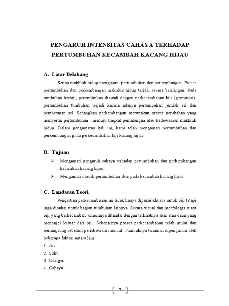 Untuk mengetahui dan membuktikan pengaruh cahaya matahari terhadap pertumbuhan dan perkembangan tanaman kacang hijau. Makalah ini diajukan guna memenuhi nilai kelompok kami dalam mata pelajaran biologi kelas xii tahun pelajaran 2015 2016. Makalah pengaruh intensitas cahaya terhadap pertumbuhan kecambah kacang hijau kata pengantar puji syukur kami panjatkan ke hadirat tuhan yang maha esa karena atas kehendak nyalah kami dapat menyelesaikan makalah laporan pengaruh intensitas cahaya terhadap pertumbuhan kecambah kacang hijau yang dibimbing oleh ibu irma rahmawati s pd.