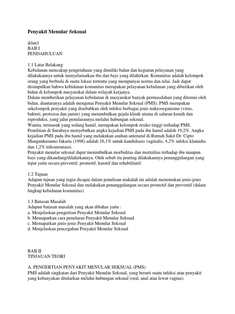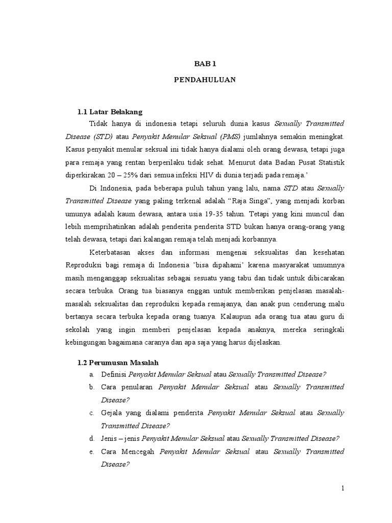 Makalah penyakit menular seksual. Kelompok remaja dan dewasa muda 15 24 tahun adalah kelompok umur yang memiliki risiko paling tinggi untuk tertular pms 3 juta kasus baru tiap tahun. Menurut the centers for disease control cdc terdapat lebih dari 15 juta kasus pms dilaporkan per tahun. Penyakit menular seksual akan lebih beresiko bila melakukan hubungan seksual dengan berganti ganti pasangan baik melalui vagina oral maupun anal.
