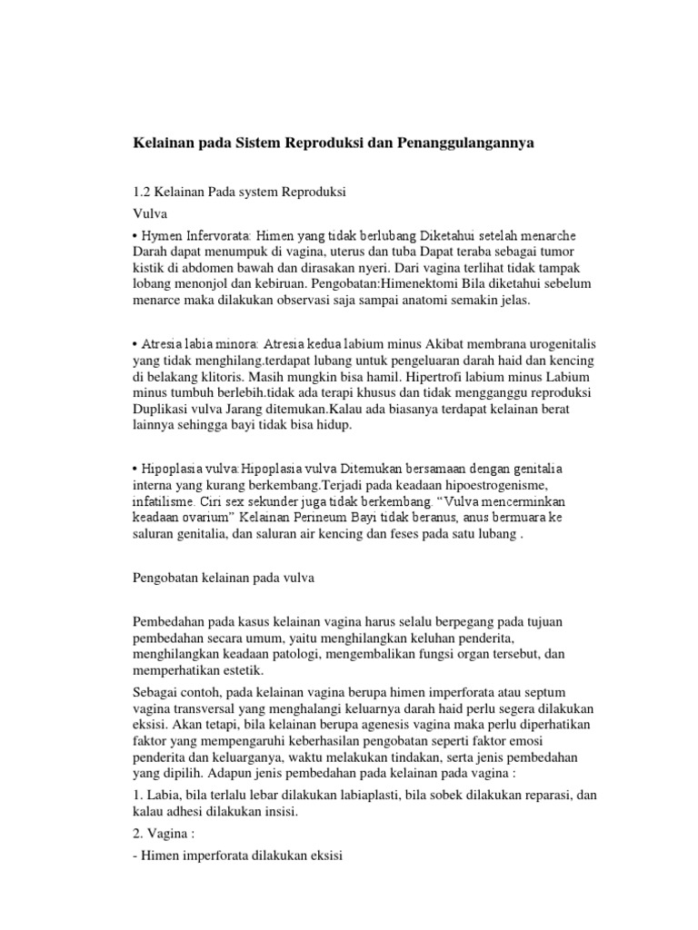 Hal ini merupakan tanda wanita telah menghasilkan sel telur. Sistem reproduksi pada manusia mulai terlihat jelas pada saat usia subur yaitu diawali pubertas pada wanita ditandai peristiwa haid menstruasi yaitu keluarnya darah akibat dari meluruhnya selaput rahim endometrium disertai pecahnya pembuluh darah. Makalah kelainan sistem reproduksi.