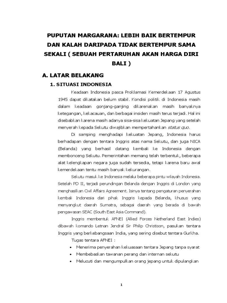 Di dalam indonesia kesadaran masyarakatnya akan sejarah negaranya sendiri masih terbilang rendah seakan melupakan petuah dari presiden indonesia yang pertama kita yaitu ir. Makalah perang puputan margarana makalah. Tapi tetap saja apa yang i gusti ngurah rai lakukan adalah hal yang benar karena akan lebih baik mati setelah perjuangan habis habisan daripada tidak berusaha sama sekali.