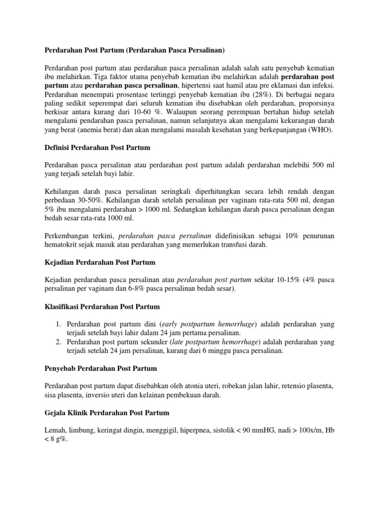 Makalah lengkap pendarahan post partum dan penangannya pendarahan pasca persalinan. Terjadi perdarahan berkepanjangan melampaui pengeluaran. Perdarahan postpartum sekunder late postpartum hemor rhage yang terjadi antara 24 jam dan 6 minggu setelah anak lahir.