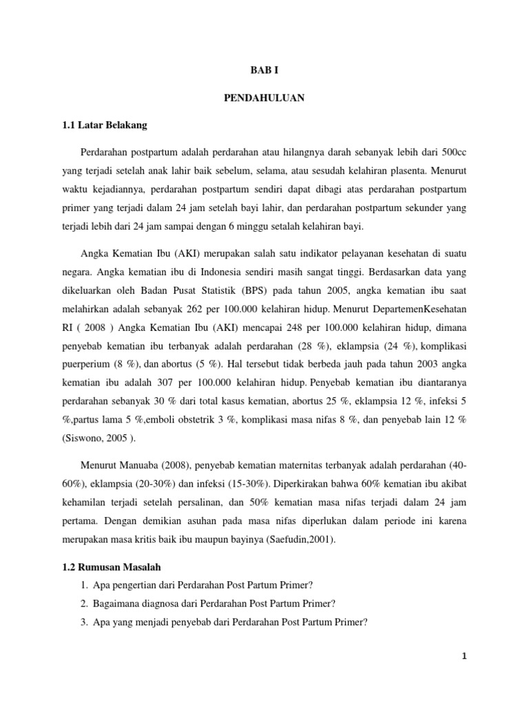 Angka kematian ibu di indonesia menurut departemen kesehatan tahun 2002 adalah 307 per 100 000 kelahiran hidup. Perdarahan postpartum dapat dibedakan menjadi perdarahan postpartum primer dan perdarahan postpartum sekunder. Tanda dan gejala tanda dan gejala terjadinya pendarahan post partum skunder antara lain sebagai berikut pendarahan terjadi.