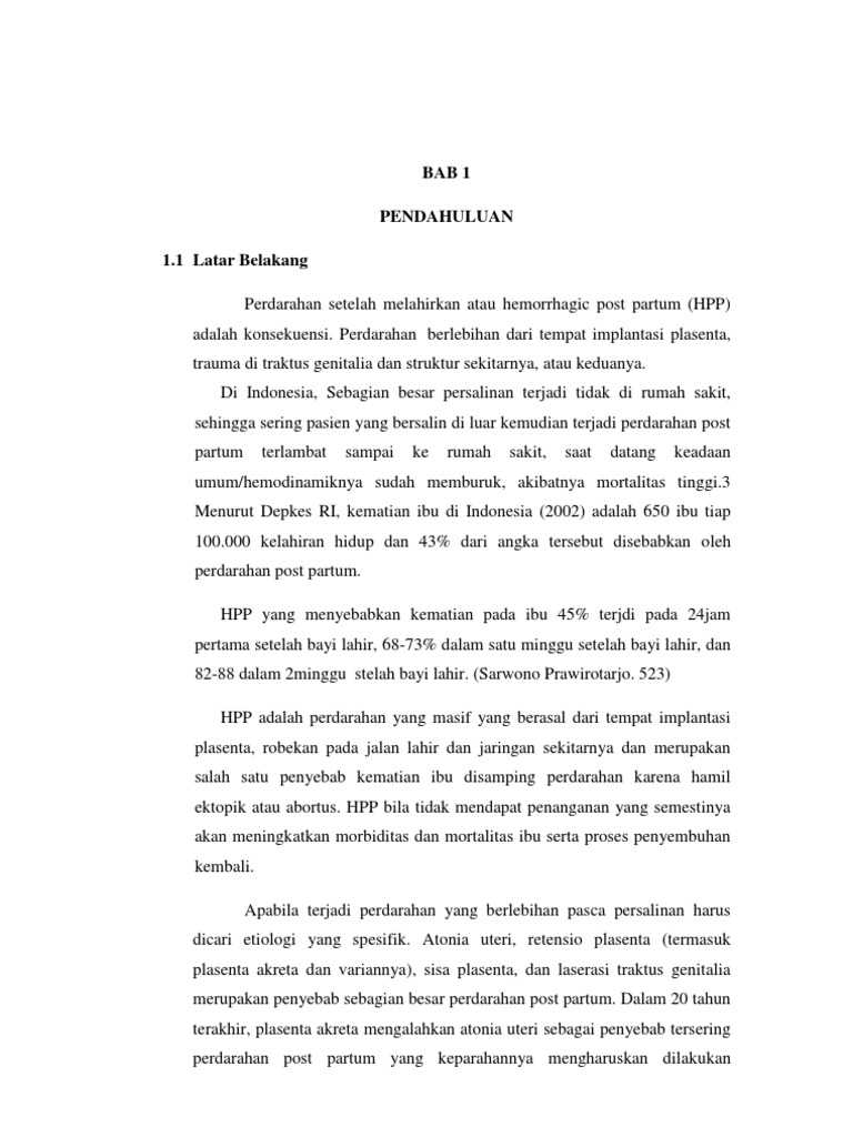 Angka kematian ibu di indonesia menurut departemen kesehatan tahun 2002 adalah 307 per 100 000 kelahiran hidup. Haemoragic post partum hpp adalah hilangnya darah lebih dari 500 ml dalam 24 jam pertama setelah lahirnya bayi. 2 menurut waktu terjadinya dibagi atas dua bagian.