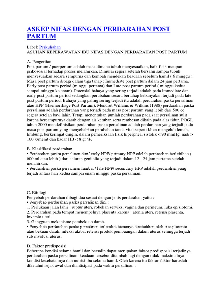 Perdarahan post partum batasan perdarahan post partum adalah perdarahan melebihi 500 ml yang terjadi setelah bayi lahir. Perdarahan postpartum sekunder late postpartum hemor rhage. Perdarahan postpartum adalah perdarahan lebih dari 500 600 ml dalam masa 24 jam setelah anak lahir.