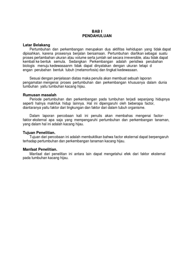 Penelitian ini dilator belakangi oleh karena masih banyak orang membuat kecambah kacang hijau dengan cara kenvensional padahal berhasil tidaknya kecambah kacang hijau dipengaruhi oleh rangsangan yang berasal dari lingkungan seperti sinar matahari yang dapat mempengaruhi pertumbuhan dan perkembangan kecambah kacang hijau. Makalah ini dibuat untuk mengetahui dan membedakan pertumbuhan dan perkembangan pada kacang hijau melalui hasil penelitian yang telah dilakukan. Penulis menyadari dalam pembuatan makalah ini masih banyak kesalahan dan kekurangan.