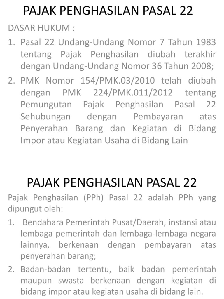 Makalah pph pasal 22. Sebab pph pasal 22 dapat dikenakan saat penjualan ataupun pembelian. Dasar hukum pph pasal 22 adalah uu pajak penghasilan nomor 36 tahun 2008 pasal 22 untuk lebih memahami secara mendalam dan kompherensif mengnai pajak penghasilan pph pasal 22 maka yang akan di bahas dalam makalah ini paparan mengenai pph pasal 22. Bank devisa dan direktorat jenderal bea dan cukai djbc atas objek pph pasal 22 impor barang.