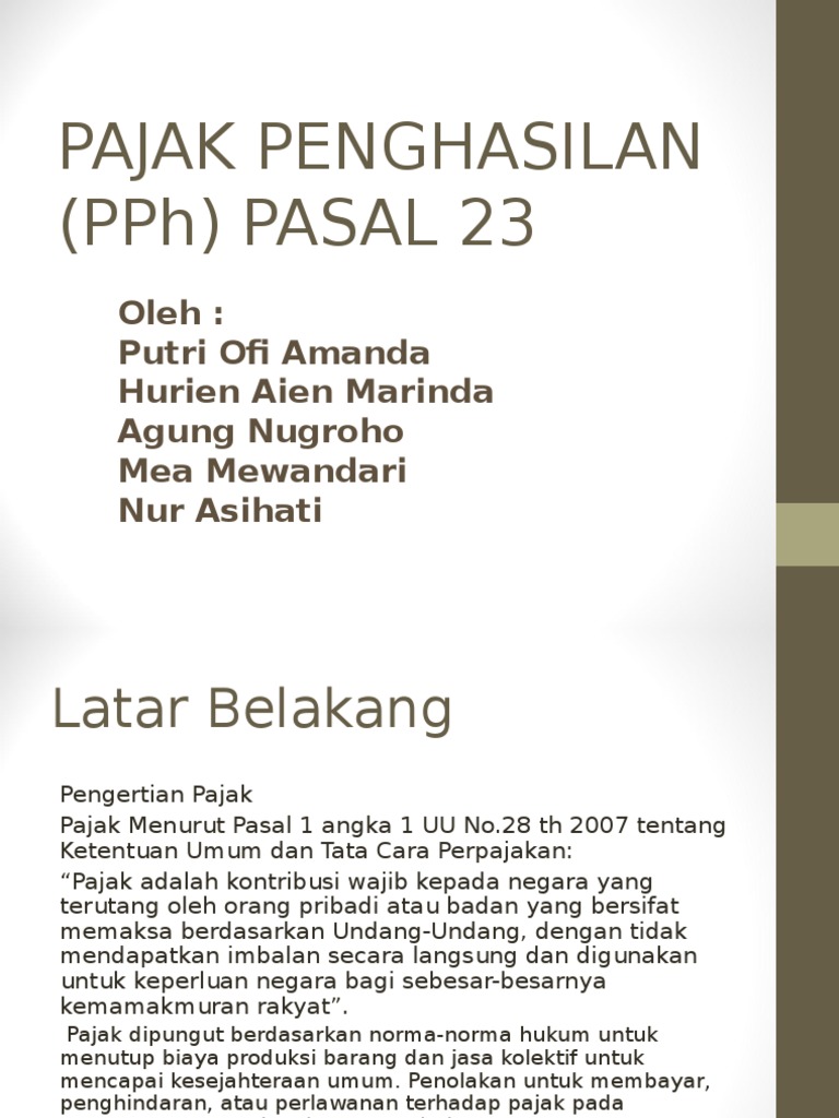 Untuk mendukung berjalannya pembangun. Pph pasal 23 makalah untuk memenuhi tugas kelompok semester 3 mata kuliah pemotongan dan pemungutan pph. Pada umumnya pph pasal 22 dikenakan terhadap perdagangan barang yang dianggap menguntungkan sehingga baik penjual maupun pembelinya dapat menerima keuntungan.