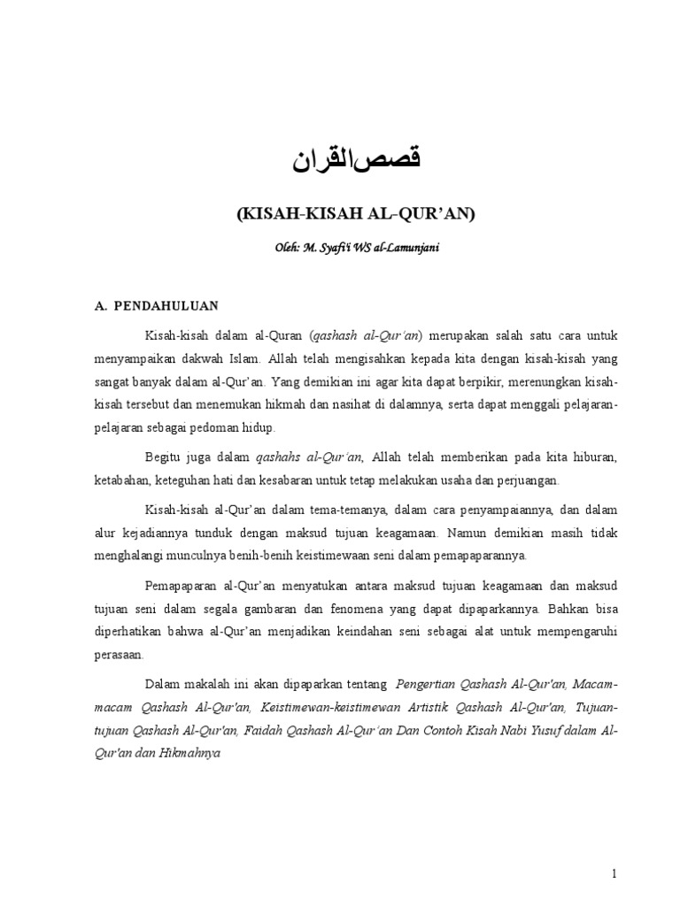 Makalah qashash al qur an qashash al qur an. Berdasarkan penguraian tentang qashash al qur an diatas menceritakan kisah kisah dalam al qur an sebagai metode pembelajaran pendidikan agama terutama untuk para pendidik adalah cara yang tepat mengingat usia anak anak yang dapat lebih menyerap kisah tersebut dan akan berlanjut dari pembicaraan meraka dengan individu individu lainnya. Al qur an merupakan kalamullah yang diwahyukan allah subhanahu wa ta ala kepada nabi muhammad shallallahu alaihi wa sallam sebagai rasul terakhir melalui perantara malaikat jibril yang tepercaya dijadikan sebagai pedoman hidup bagi umat.