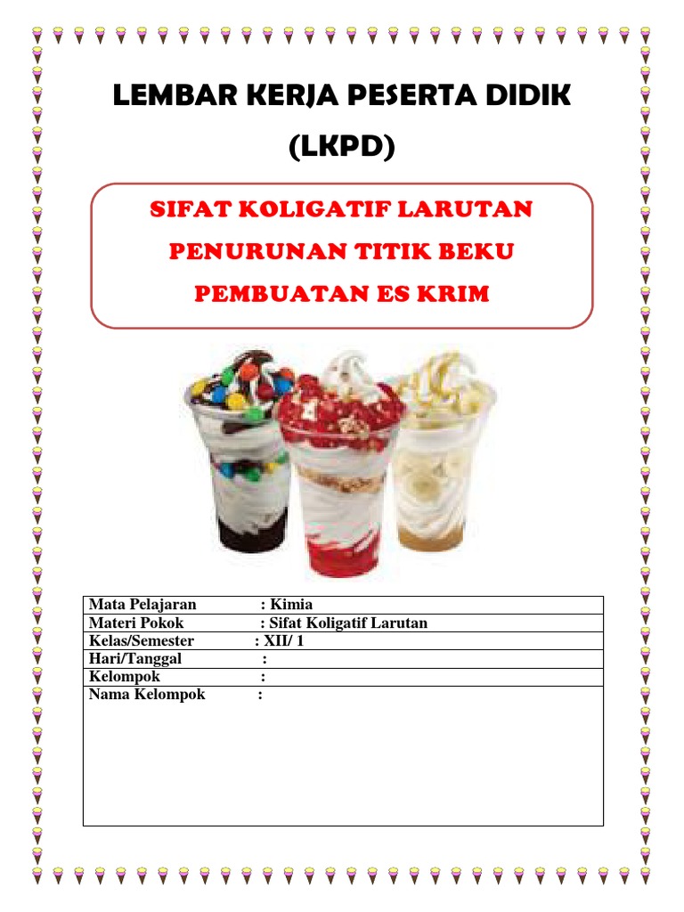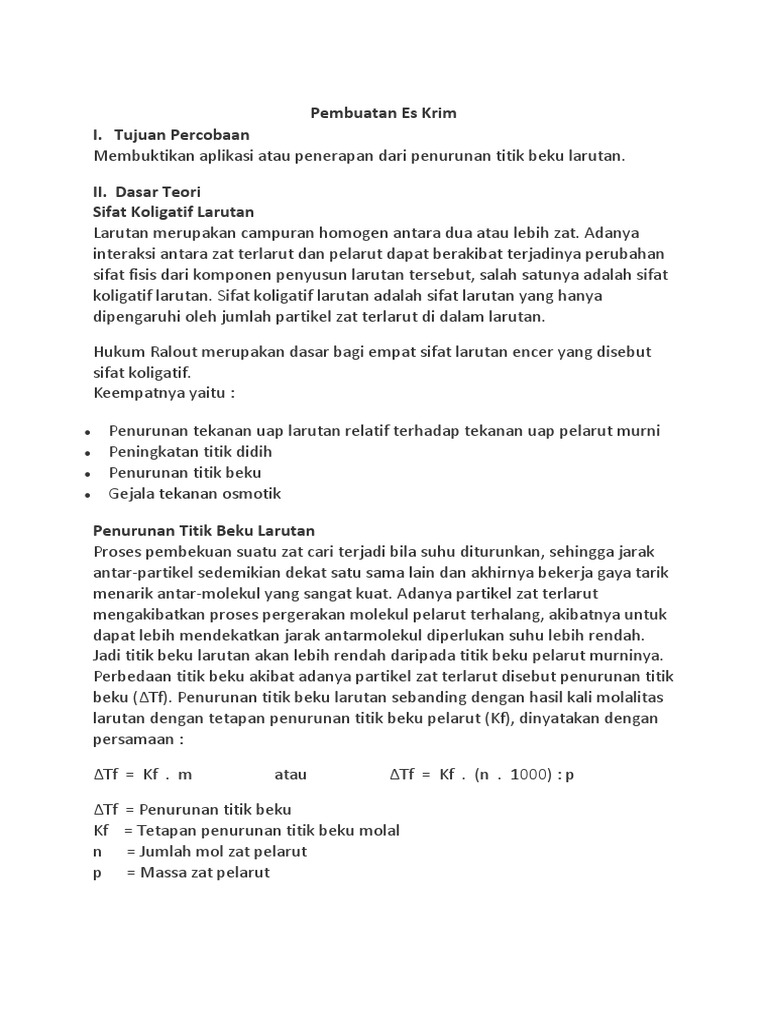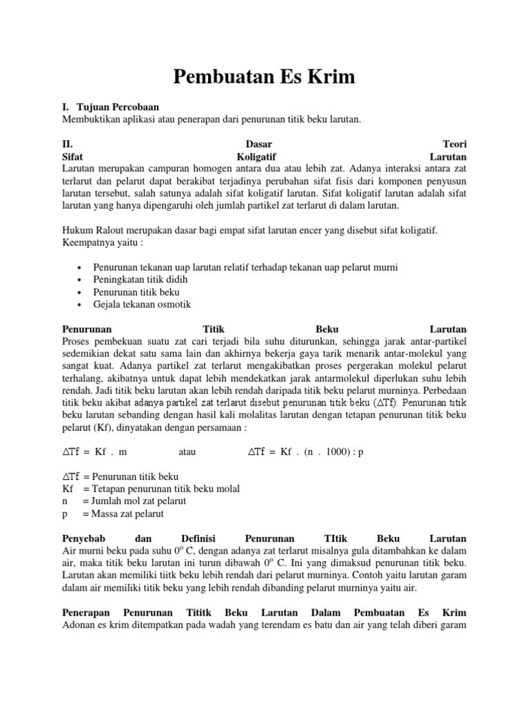 Makalah sifat koligatif larutan pembuatan es krim. Proses tersebut mengakibatkan adonan es krim membeku dengan titik beku es beberapa derajat dibawah. Untuk dapat mengetahui dan memahami cara pembuatan es krim dengan mudah c. Kemudian membuat es krim berdasarkan sifat koligatif penurunan titik beku larutan.