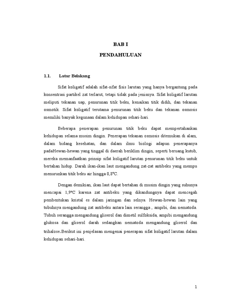 Sifat koligatif larutan adalah sifat sifat larutan yang tidak bergantung pada jenis zat terlarut tetapi hanya bergantung pada konsentrasi partikel terlarutnya. Dalam penyusunan makalah ini. Adanya interaksi antara zat terlarut dan pelarut dapat berakibat terjadinya perubahan sifat fisis dari komponen penyusun larutan tersebut salah satunya adalah sifat koligatif larutan.