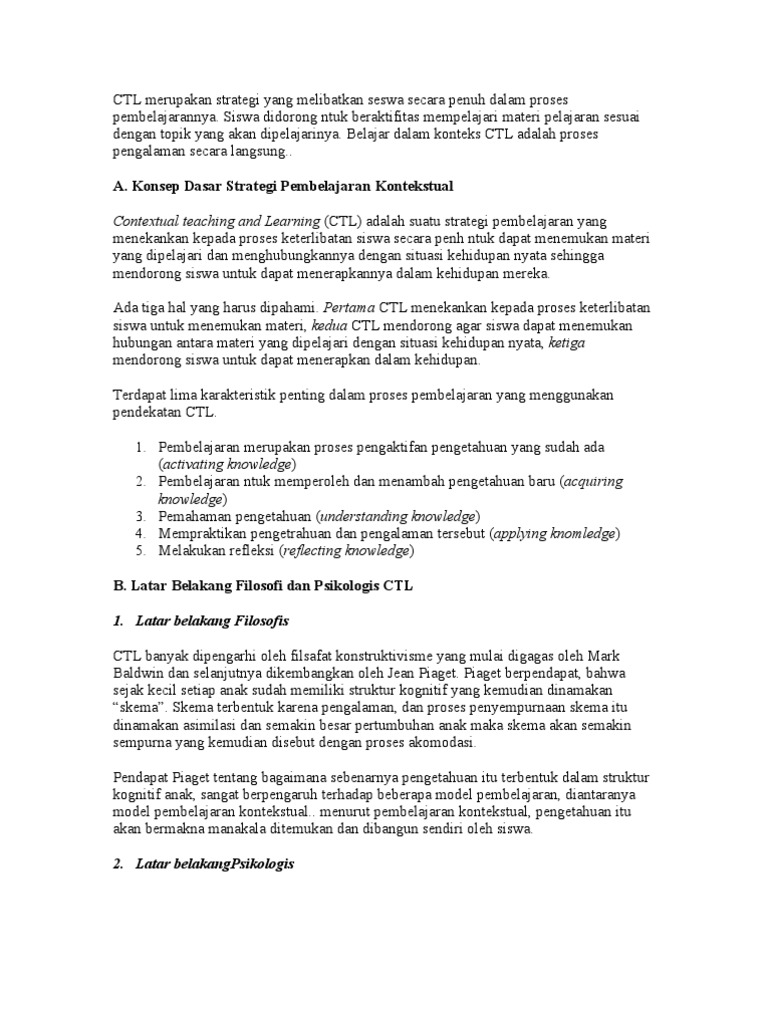 Ctl merupakan strategi yang melibatkan seswa secara penuh dalam proses pembelajarannya. Pembelajaran kontekstual adalah suatu strategi pembelajaran yang menekankan kepada proses keterlibatan siswa secara penuh untuk dapat menemukan materi yang dipelajari dan menghubungkannya dengan situasi kehidupan nyata sehingga mendorong siswa untuk dapat menerapkannya dalam kehidupan meraka sanjaya 2005 109. Oleh karena itu pada makalah ini penjelasan tentang pembelajaran kontekstual akan dibahas secara mendalam.