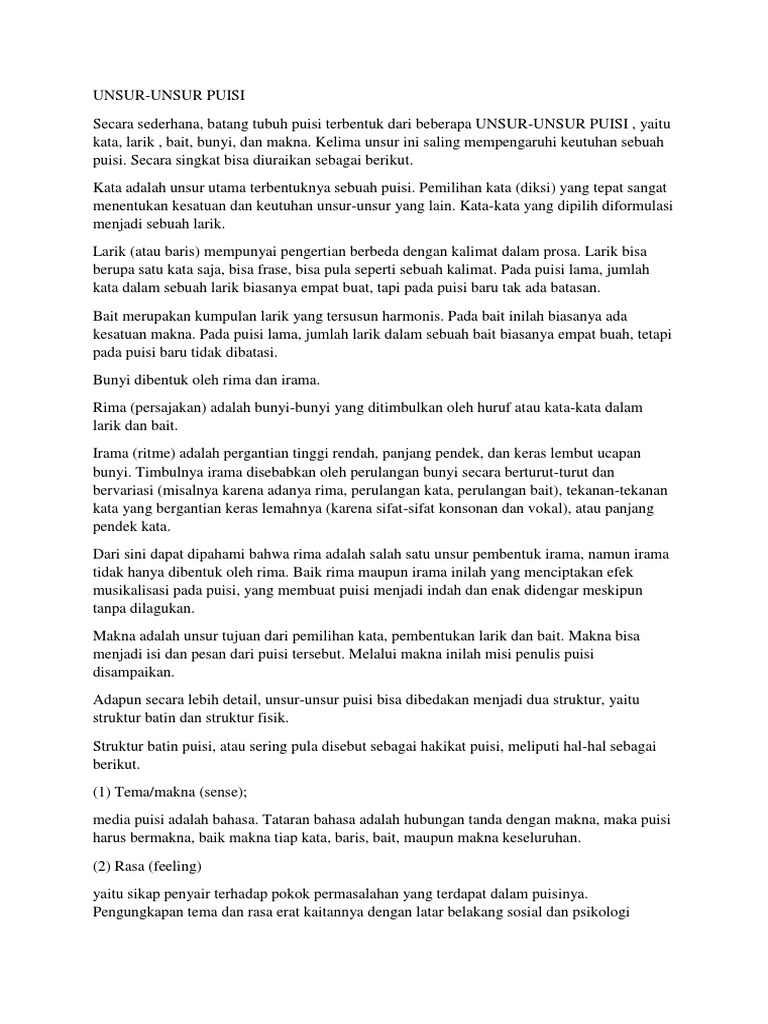 Pengertian puisi ciri jenis jenis unsur struktur puisi secara umum pengertian puisi adalah bentuk karya sastra dari hasil ungkapan dan perasaan penyair dengan bahasa yang terikat irama matra rima penyusunan lirik dan bait serta penuh makna puisi mengungkapkan pikiran dan perasaan penyair secara imajinatif dan disusun dengan mengonsentrasikan kekuatan bahasa dengan struktur fisik dan. Dalam penyusunan makalah ini saya mendapatkan beberapa halangan dan rintangan yang harus saya lewati tetapi berkat dorongan dan bantuan dari berbagai pihak saya bisa menyelesaikannya walaupun saya sadari makalah ini masih jauh dari kesempurnaan. Struktur fisik puisi meliputi hal hal sebagai berikut.