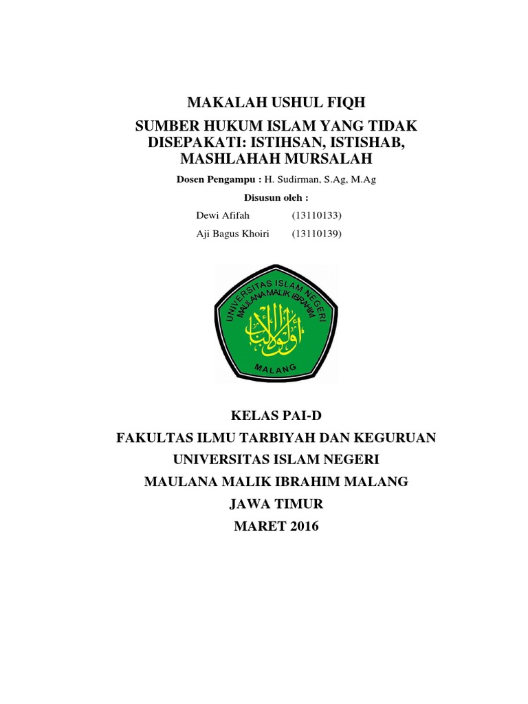Makalah sumber hukum islam yang disepakati. Sumber hukum islam merupakan suatu rujukan atau dasar yang utama dalam pengambilan hukum islam. Makalah sumber hukum islam yang tidak disepakati. Sumber hukum yang diperselisihkan pemakaiannya ada enam yaitu istihsan maslahah mursalah ihtishhab urf madzhab shahabi syaru man qablana.