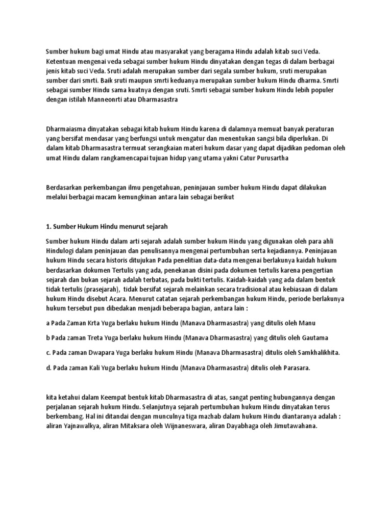 Weda sebagai sumber hukum yang bersifat memaksa yang dijelaskan dalam kitab i. Sumber hukum hindu dalam arti sejarah adalah sumber hukum hindu yang digunakan oleh para ahli hindulogi dalam peninjauan dan penulisannya mengenai pertumbuhan serta kejadiannya. 1 2 sumber hukum dalam arti sosiologis penggunaan sumber hukum ini biasanya dipergunakan oleh para sosiolog dalam menyusun thesa thesanya sumber hukum itu dilihat dari keadaan ekonomi masyarakat pada jaman jaman sebelumnya.