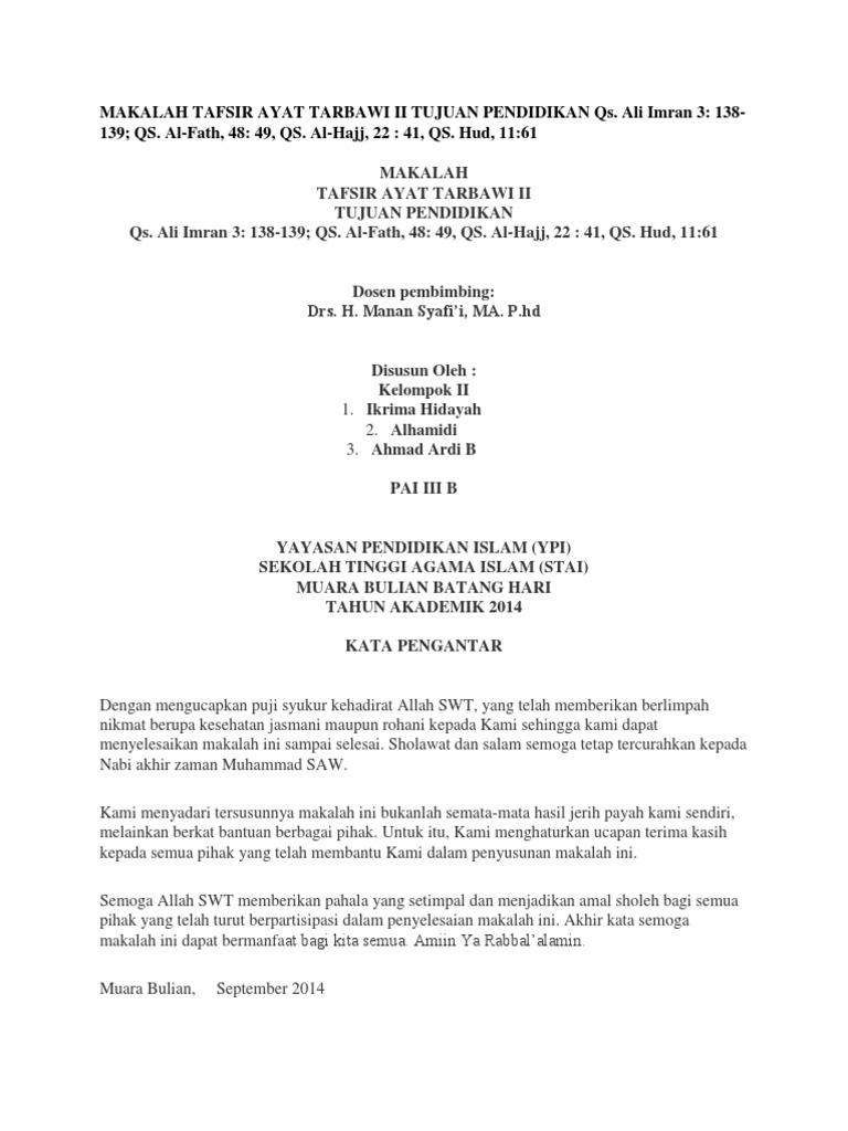 Makalah tafsir tarbawi tentang materi pendidikan. Materi pendidikan makalah disusun guna memenuhi tugas mata kuliah. Rika rahmawati 13 1 01 0167 fakultas tarbiyah dan ilmu keguruan institut agama islam negeri palu 2015 kata pengantar assalamu alaikum war wab alhamdulillah berkat rahmat dan karunia allah swt. Makalah tafsir tarbawi tafsir ayat tentang materi pendidikan disusun oeh.