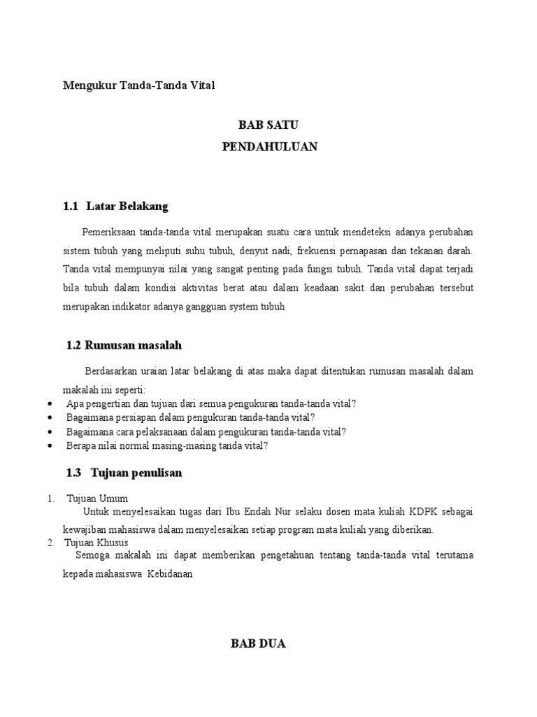 Makalah tanda tanda vital pdf. Sebagai indikator dari status kesehatan ukuran ukuran ini menandakan keefektifan sirkulasi respirasi fungsi neural dan endokrin tubuh karena sangat penting maka disebut tanda vital. Prosedur pameriksaan tanda vital yang dilakukan pada pasien meliputi pengukuran suhu pemeriksaan denyut nadi pemeriksaan pernapasan dan pengukuran tekanan darah. Makalah tanda tanda vital pdf.