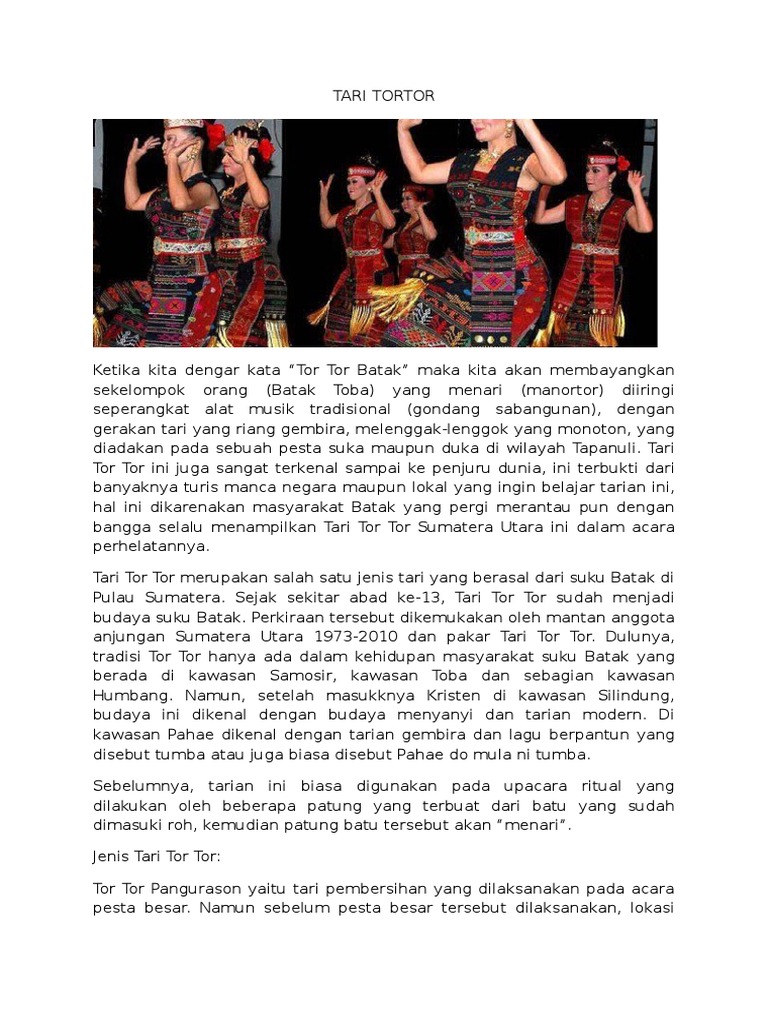 Konon kata tortor berasal dari tor tor bunyi hentakan kaki penari di lantai papan rumah adat batak. Sebagai negara yang kaya akan budaya dan tradisi indonesia memang memiliki pesona yang luar biasa. Tarian tor tor merupakan salah satu jenis tarian yang berasal dari suku batak di pulau sumatera sejak sekitar abad ke 13 tari tor tor sudah menjadi budaya suku batak.