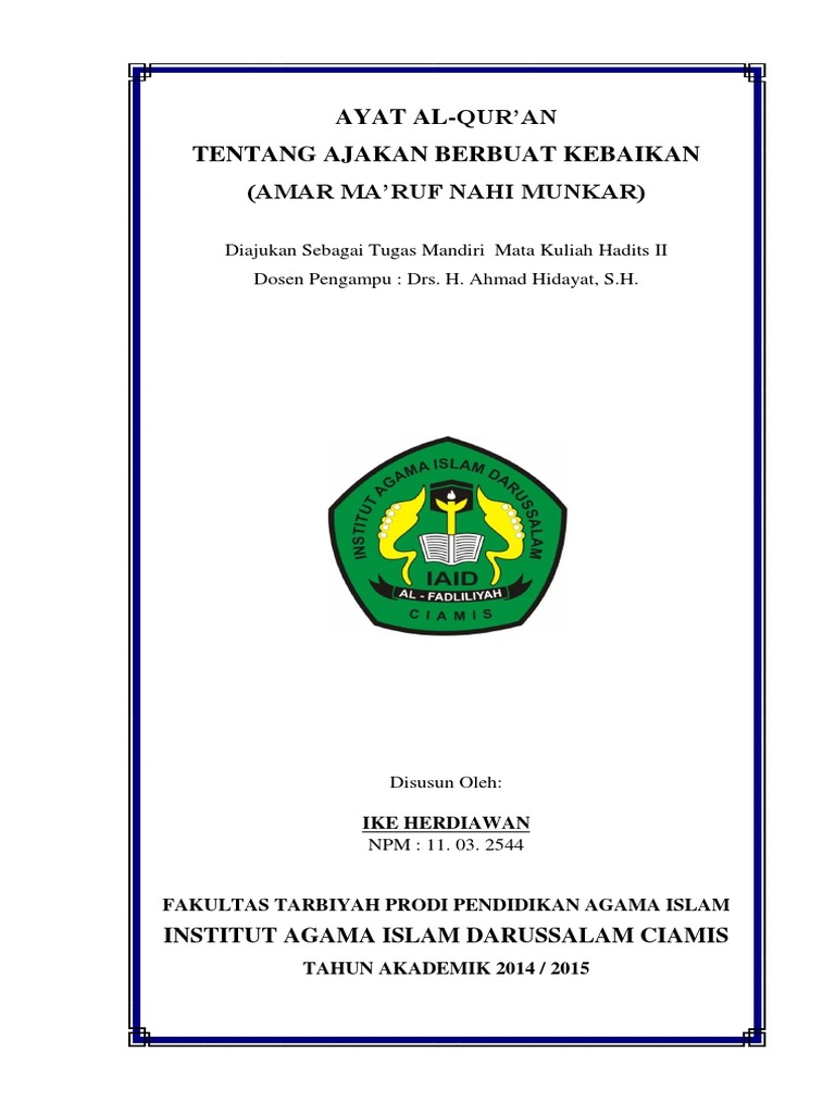 Ayat alquran tentang amar ma ruf nahi mungkar dan perintah berdakwah istilah amar ma ruf nahi mungkar seringkali kita dengar dalam kehidupan sehari hari. Academia edu is a platform for academics to share research papers. Kewajiban menegakkan kedua hal itu adalah merupakan hal yang sangat penting dan tidak bisa ditawar bagi siapa saja yang mempunyai kekuatan dan kemampuan melakukannya.