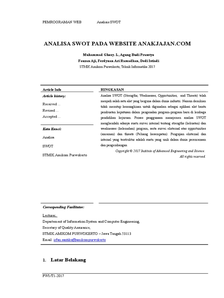 Makalah tentang analisis swot. Berikut ini makalah tentang analisis etika profesi seorang projek manajer bab i pendahuluan tuntutan untuk menguasai pengetahua. Makalah analisis swot merupakan bahan materi tentang strategi bisnis dalam menjalankan sebuah organisasi atau perusahaan. Contoh analisis swot organisasi produk makanan dan diri sendiri materi pembahasan kali yakni tentang contoh analisis swot yang akan guruakutansi co id paparkan secara lengkap mulai dari pengertian tujuan dan contohnya nah untuk lebih jelasnya mari langsung aja simak ulasan berikut ini.