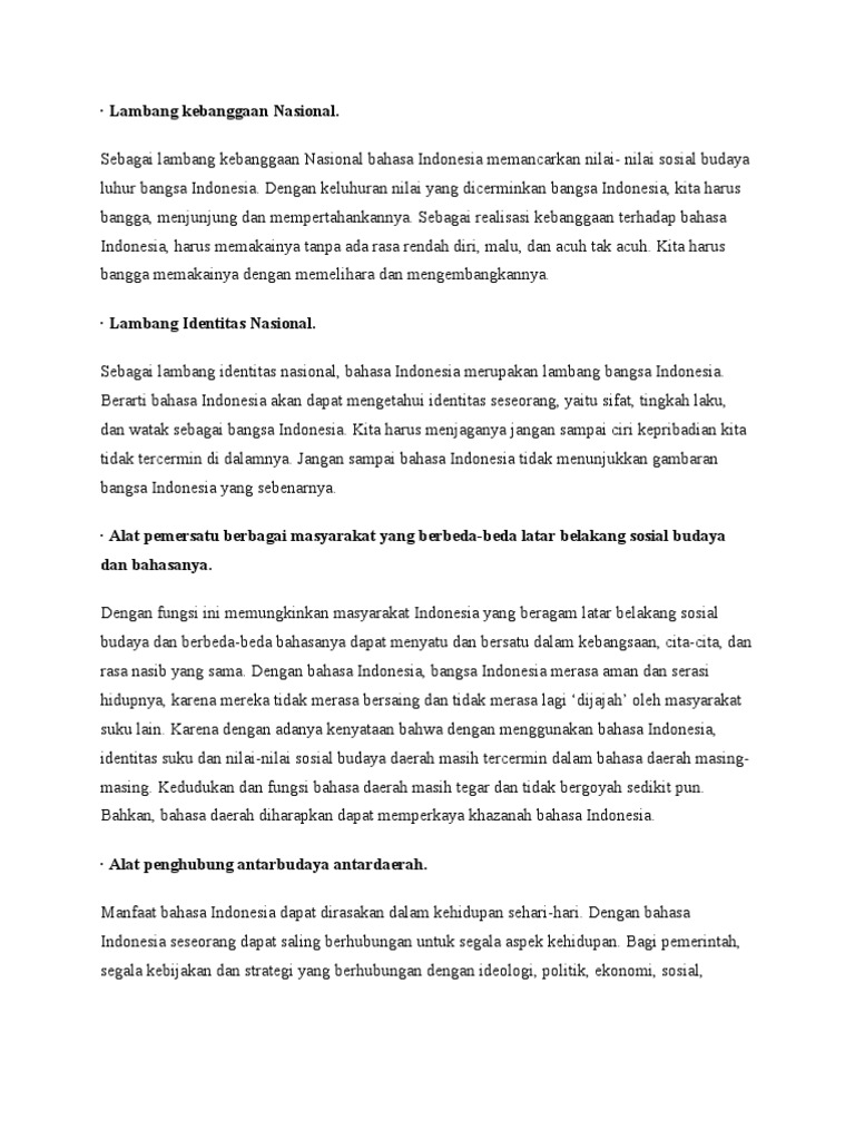 Makalah tentang bahasa indonesia sebagai pemersatu bangsa. Bahasa indonesia lahir pada tanggal 28 oktober 1928. Peran bahasa indonesia dalam pembangunan untuk dapat meminimalisir adanya gejolak yang mengancam kerukunan dan kesatuan bangsa bahasa indonesia adalah sebagai alat pemersatu untuk menjaga stabilitas nasional sehingga tercipta masyarakat yang kondusif yang pada akhirnya mempercepat proses pembangunan di berbagai bidang di seluruh wilayah nusantara. Bahasa menunjukkan bangsa itu artinya bahasa sebagai identitas bangsa itu sendiri.