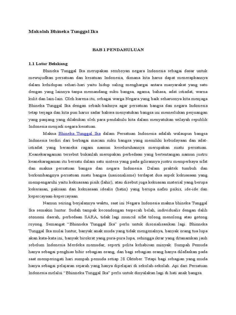 Bhineka tunggal ika pun telah menumbuhkan semangat persatuan dan kesatuan negara kesatuan republik indoesia. Materi materi bertujuan agar menambah pengetahuan dan wawasan pembaca dalam memahami konsep tentang bhinneka tunggal ika. Latar belakang makalah bhinneka tunggal ika bangsa indonesia terbentuk melalui suatu proses sejarah yang cukup panjang sejak dulu mulai zaman kerajaan kutai sriwijaya majapahit sampai datangnya bangsa bangsa lain untuk menguasai bangsa indonesia.