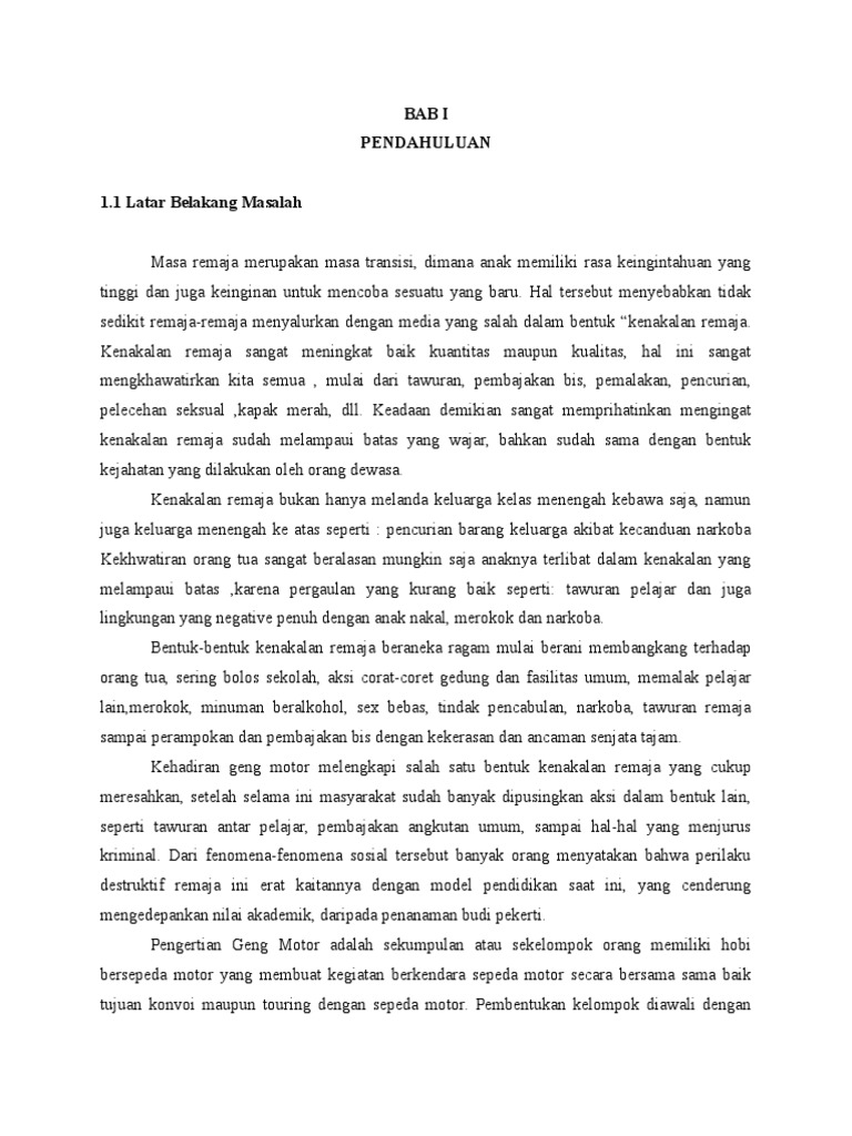 Makalah tentang geng motor. Geng motor merupakan salah satu fenomena masalah sosial yang berhubungan erat dengan persoalan kesulitan remaja dalam melakukan adaptasi dengan modernisasi baik dari aspek kemunculannya karakter anggotanya maupun dari jenis kegiatannya. Di antaranya pk atau penjahat kelamin arc jrc street demon atiet abang dan sincan atau sindikat cewek nekat yang anggotanya perempuan semua. Adapun manfaatnya adalah sebagai berikut.