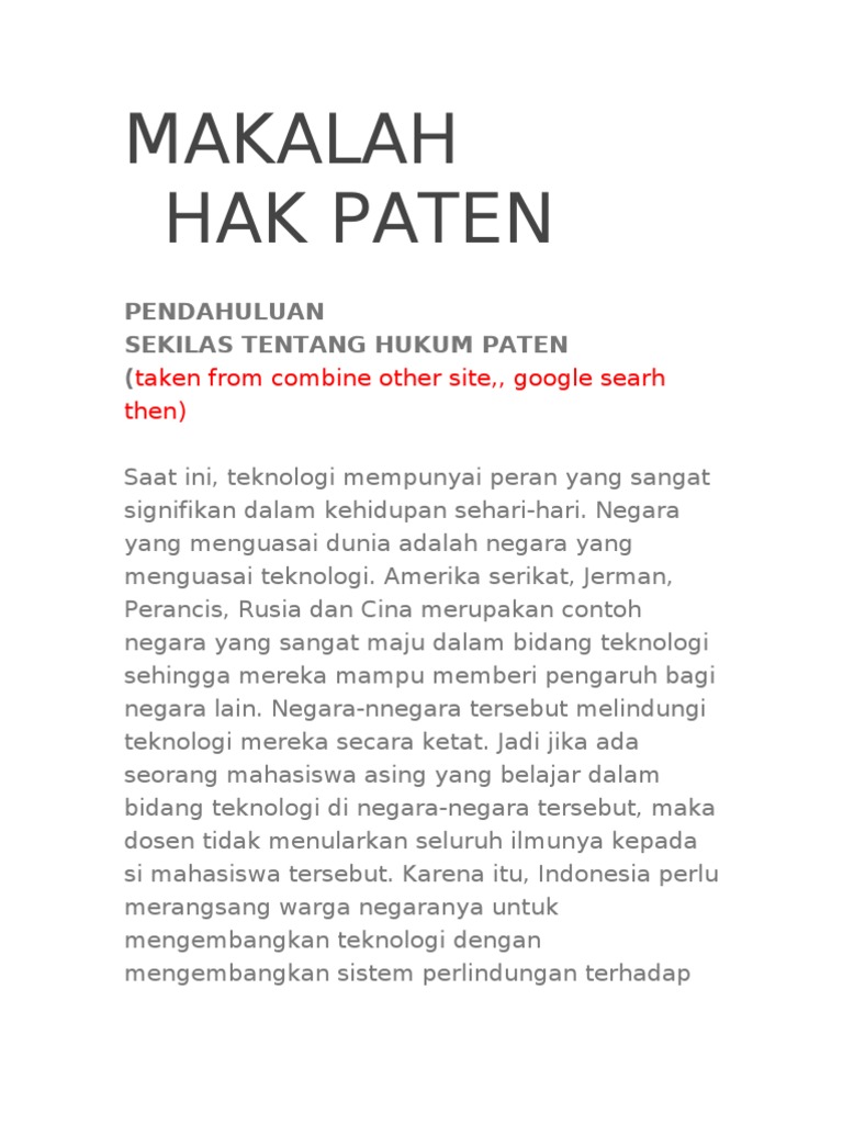 Makalah tentang hak paten. Mengenai ruang lingkup perlindungan paten di indonesia sesuai dengan undang undang no. Paten sebagai bagian haki. Menurut undang undang nomor 14 tahun 2001 tentang paten paten adalah hak eksklusif yang diberikan oleh negara kepada inventor atas hasil invensinya di bidang teknologi yang untuk selama waktu tertentu melaksanakan sendiri invensinya tersebut atau memberikan persetujuannya kepada pihak lain untuk melaksanakannya.