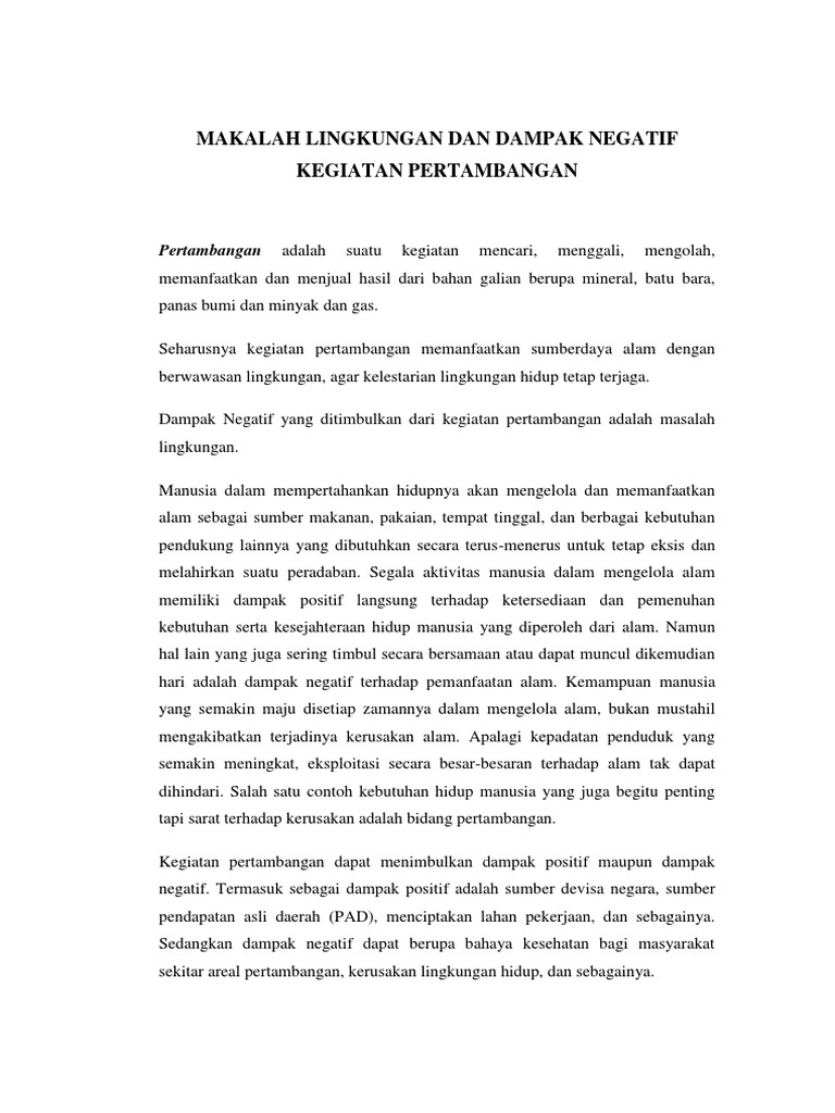 Makalah tentang kerusakan lingkungan akibat pertambangan. Kerusakan hutan akibat pertambangan batubara bahan tambang merupakan bahan yang berada didalam bumi sehingga untuk mengambilnya perlu dilakukan penggalian. Laju deforestasi di indonesia menurut perkiraan world bank antara 700 000 sampai 1 200 000 ha per tahun dimana deforestasi oleh peladang berpindah ditaksir mencapai separuhnya. Perubahan lingkungan akibat kegiatan pertambangan dapat bersifat permanen atau tidak dapat dikembalikan kepada keadaan semula.