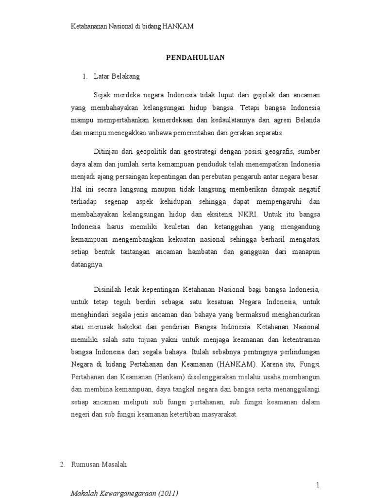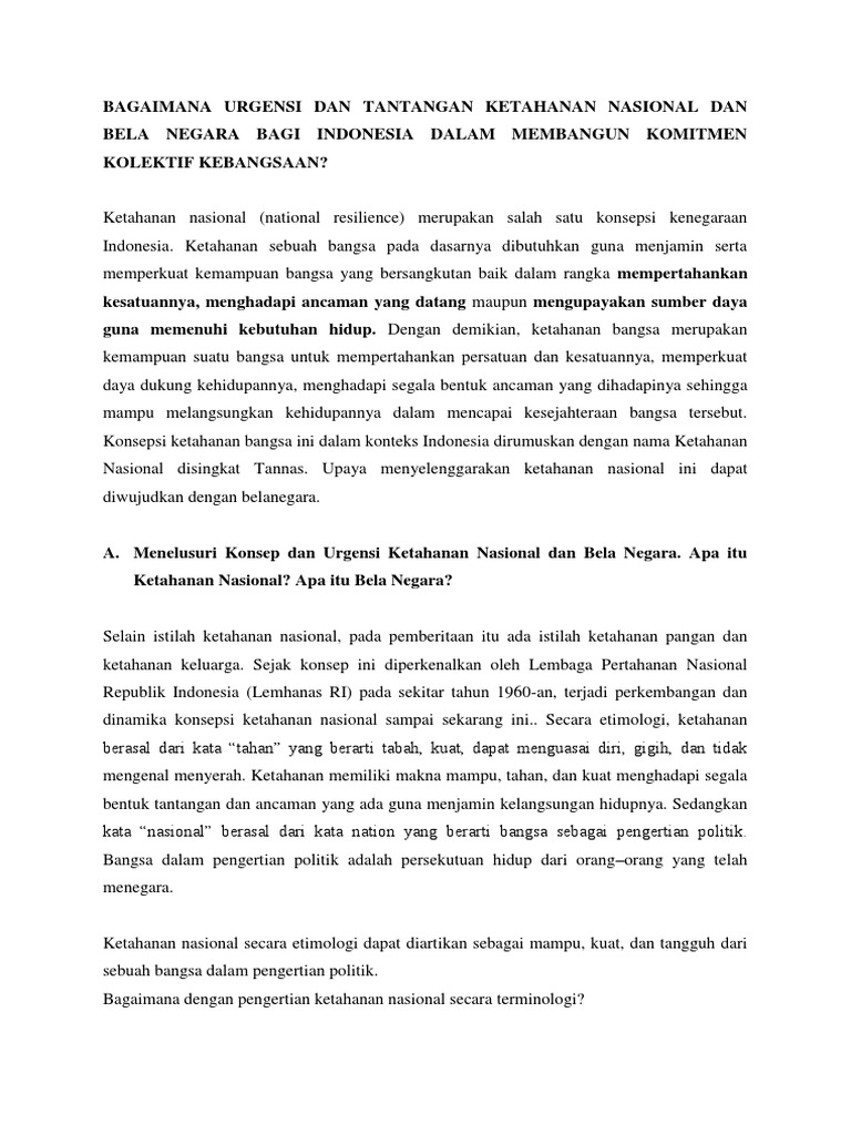 Makalah tentang ketahanan nasional dan bela negara. Terdiri dari esensi urgensi dan dinamika ketahanan nasional serta esensi dan urgensi bela negara. Konsepsi ketahanan nasional adalah konsepsi pengembangan kekuatan nasional melalui pengaturan dan penyelenggaraan kesejahteraan dan keamanan yang seimbang serasi dan selaras dalam seluruh aspek kehidupan secara utuh dan terpadu berlandaskan uud 1945 dan wawasan nusantara dengan kata lain konsepsi ketahanan nasional merupakan pedoman untuk meningkatkan keuletan dan ketangguhan bangsa yang. Contoh makalah kewarganegaraan ketahanan nasional dan bela negara ini mudah mudahan bisa menjawab pencarian anda dan menjadi tambahan referensi terkait dengan contoh makalah kewarganegaraan ketahanan nasional dan bela negara seperti hubungan bela negara dengan ketahanan nasional makalah.
