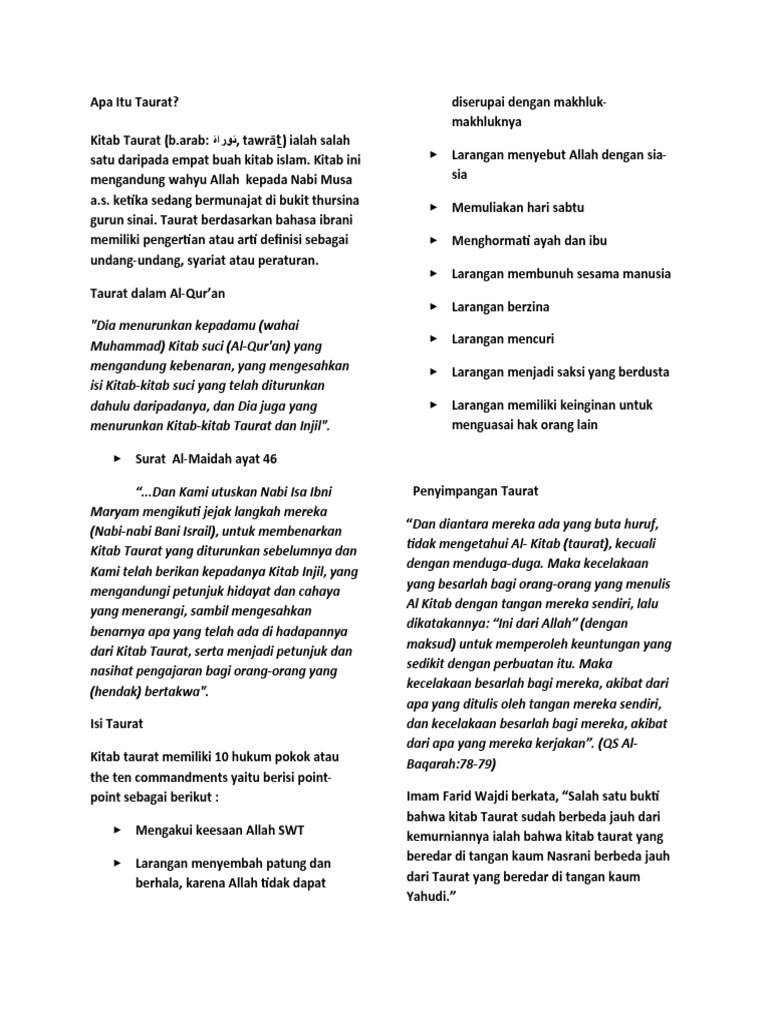 Kitab taurot mengajarkan tentang tauhid ke esa an allah swt dan kitab zabur mengajarkan puji pujian zikir dan doa kepada allah swt sedangkan injil mengajarkan tentang pembersihanjiwa raga dari kekotoran nafsu duniawi. Menerangkan hukum yang tidak ada pada kitab taurat sekaligus mengamandemen menghapus hukum hukum yang ada dalam kitab taurat. Assalamualaikum warahmatullahi wabarakatuh puji dan syukur kita panjatkan kepada allah swt karena berkat limpahan karunia dan rahmat nya kami dapat menyelesaikan makalah mata pelajaran pendidikan agama islam ini dengan lancar.