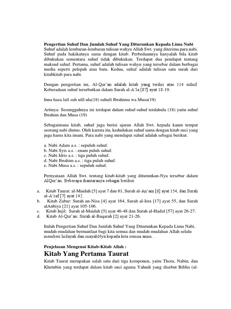 Sebab itu kita wajib beriman kepada kitab yang diturunkan allah kepada nabi ibrahim dan nabi musa berupa suhuf suhuf atau lembaran lembaran q s. Tentang kitab taurat kitab taurat adalah kumpulan firman firman allah swt yang diwahyukan kepada nabi musa as. 55 injil yang diwahyukan kepada nabi isa putra maryam q s.