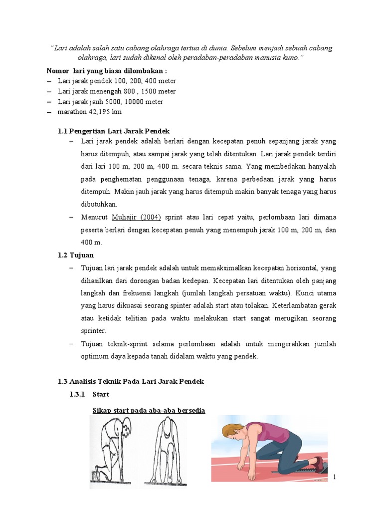 Makalah tentang lari jarak pendek 100 meter. Lari jarak pendek terdiri dari lari 100 m 200 m 400 m. Lari jarak pendek atau sprint adalah salah satu jenis lari yang dilakukan dengan kekuatan dan kecepatan penuh sepanjang garis lintasan dari start hingga finish dimana pemenangnya ditentukan berdasarkan catatan waktu yang paling singkat. Pandangan tentang lari jarak pendek sprin dari beberapa pakar di atas secara substansional memahami lari 100 meter sebagai suatu aktivitas fisik berlari yang dilaksanakan dengan menggunakan kecepatan tinggi tentu saja agar seorang atlit dapat berlari dengan kekuatan dan kecepatan yang maksimal atlit tersebut tidak bisa hanya mengandalkan bakat atau panjang tungkai yang dimilikinya.