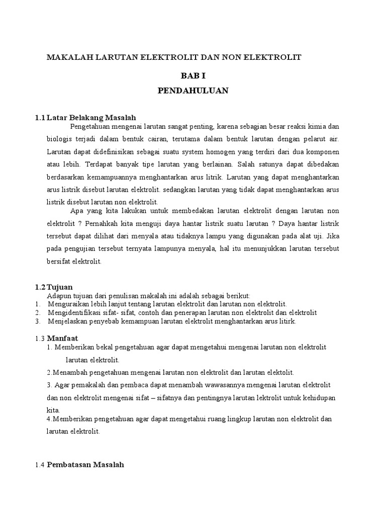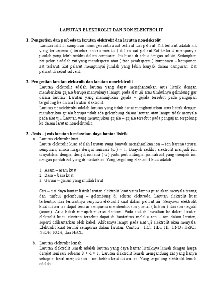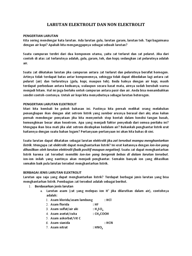Semoga dengan makalah ini dapat menambah pengetahuan serta lebih bisa memahami tentang pokok bahasan makalah ini bagi para pembacanya. Elektrolit adalah suatu zat yang larut atau terurai ke dalam bentuk ion ion dan selanjutnya larutan menjadi konduktor elektrik ion ion merupakan atom atom bermuatan elektrik. Makalah larutan elektrolit dan non elektrolit larutan adalah campuran homogen yang terdiri dari dua atau lebih zat.
