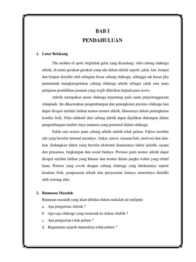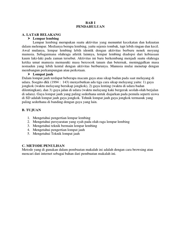 Berikut ini contoh makalah tentang seni musik dan. Dalam olahraga lempar lembing terdapat beberapa teknik yang harus diperhatikan di antaranya adalah tentang. Atletik adalah gabungan dari beberapa jenis olahraga yang secara garis besar dapat dikelompokkan menjadi lari lempar dan lompat kata ini berasal dari bahasa yunani athlon yang berarti kontes atletik merupakan cabang olahraga yang diperlombakan pada olimpiade pertama pada 776 sm induk organisasi untuk olahraga atletik di indonesia adalah pasi persatuan atletik seluruh indonesia.