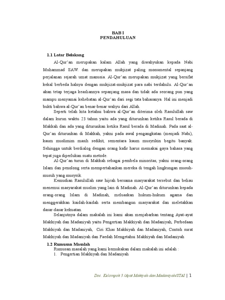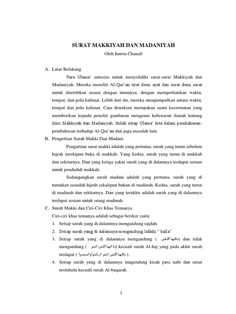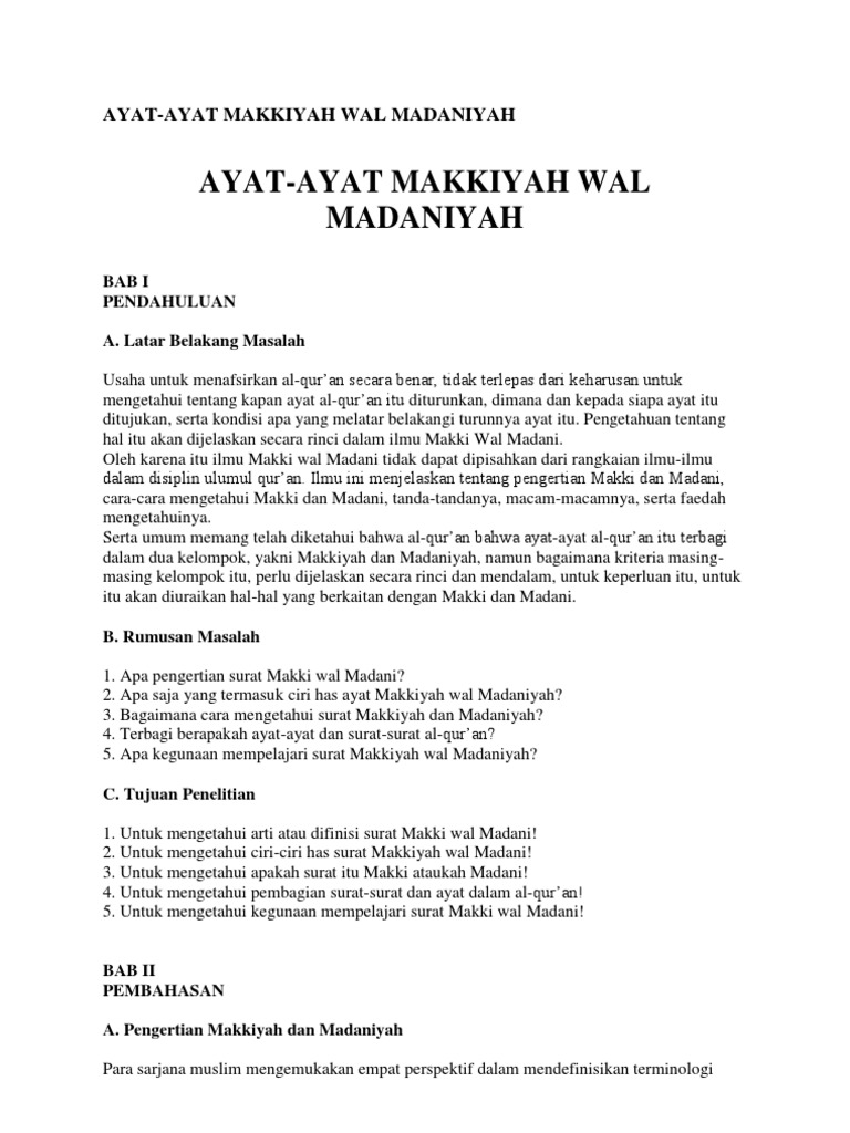 Makalah tentang makkiyah dan madaniyah. Pada umumnya para pakar ulum al qur an membahas permasalahan ini dalam suatu maudhu yang lazim disebut makkiyyah dan madaniyyah. Dalam makalah ini akan membahas tentang fase makkiyah dan fase madaniyah dimana keduanya memiliki perbedaan kandungan isi. Bagitu pentingnya arti pengelompokan yang diutarakan al qosim tentang permasalahan tentang ilmu al qur an yang terdapat dalam bukunya yang berjudul dirasah fi ulum al qur an.