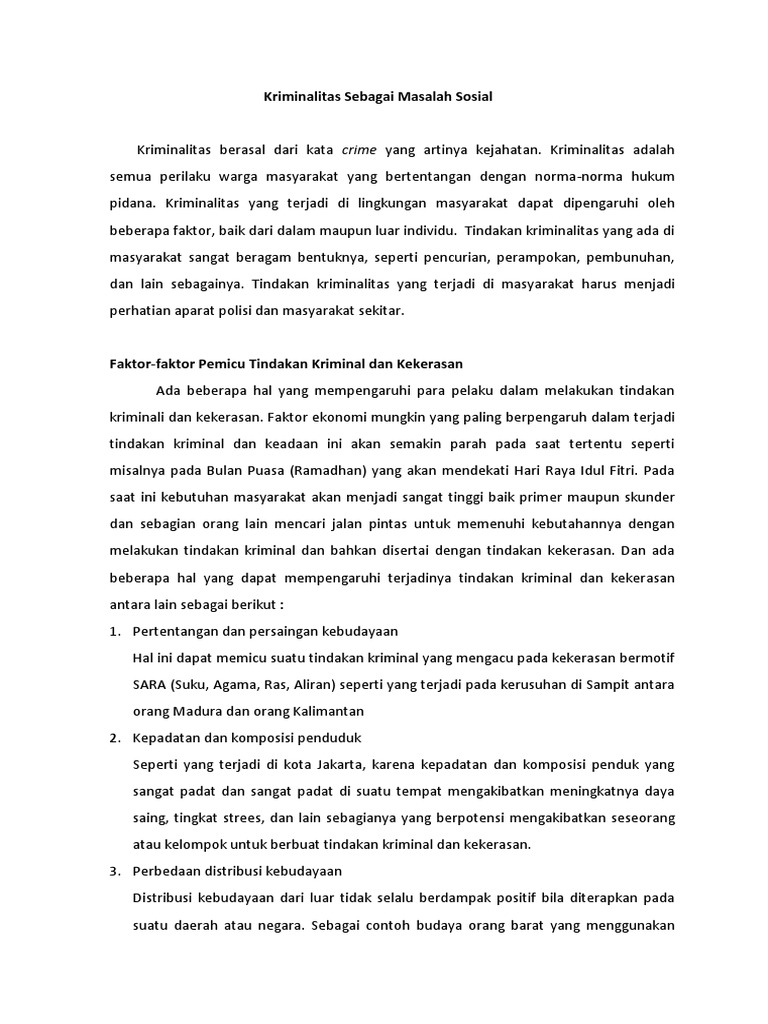 Makalah tentang masalah sosial kriminalitas. Dalam makalah ini kami akan membahas tentang. Selain itu didalam makalah ini juga dibahas mengenai faktor faktor apa saja yang menyebabkan terjadinya kriminalitas dan juga fungsi serta disfungsi kriminalitas. Makalah kriminalitas tuesday november 22 2016 add comment edit.