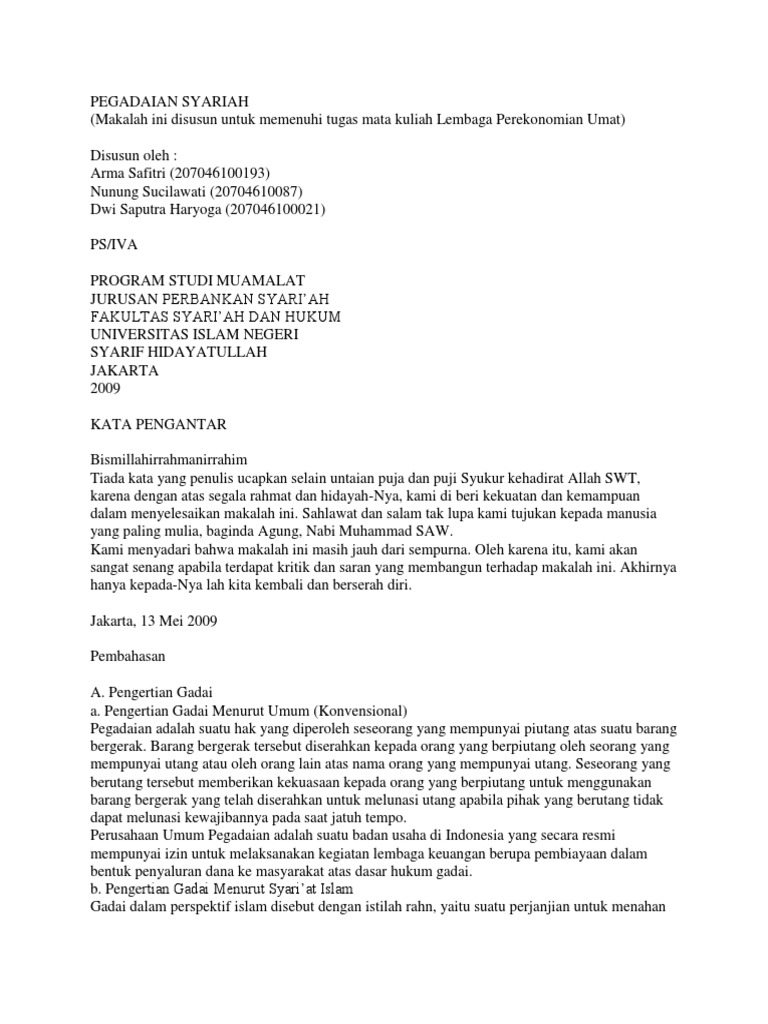 Makalah tentang pegadaian syariah pdf. Besar harapan kami agar makalah ini dapat berguna untuk para rekan rekan sesama mahasiswa dan mahasiswi dalam proses perkuliahan untuk membantu mahasiswa i dalam mencari informasi yang relevan dan aktual serta menambah dan memperluas wawasan kita mengenai ekonomi. Pegadaian terdiri dari dua macam yaitu pegadaian konvensional dan pegadaian syariah. Pegadaian syariah ialah suatu lembaga keuangan dengan memberikan pinjaman kepada nasabah yang menerapkan prinsip syariah islam di dalamnya.