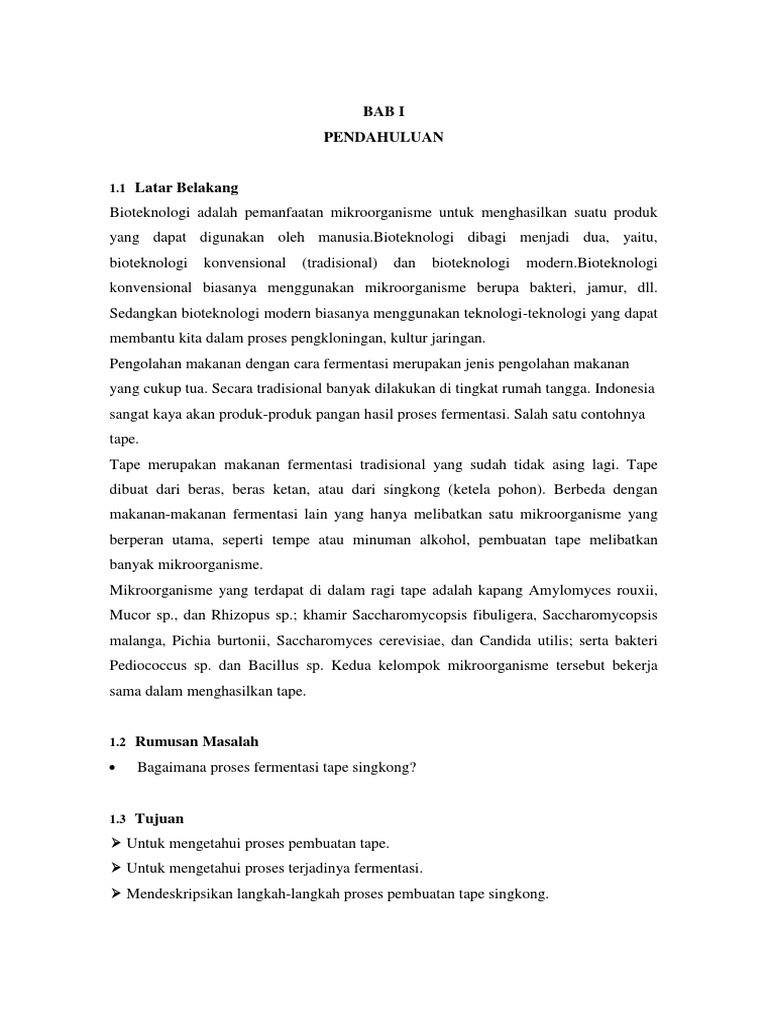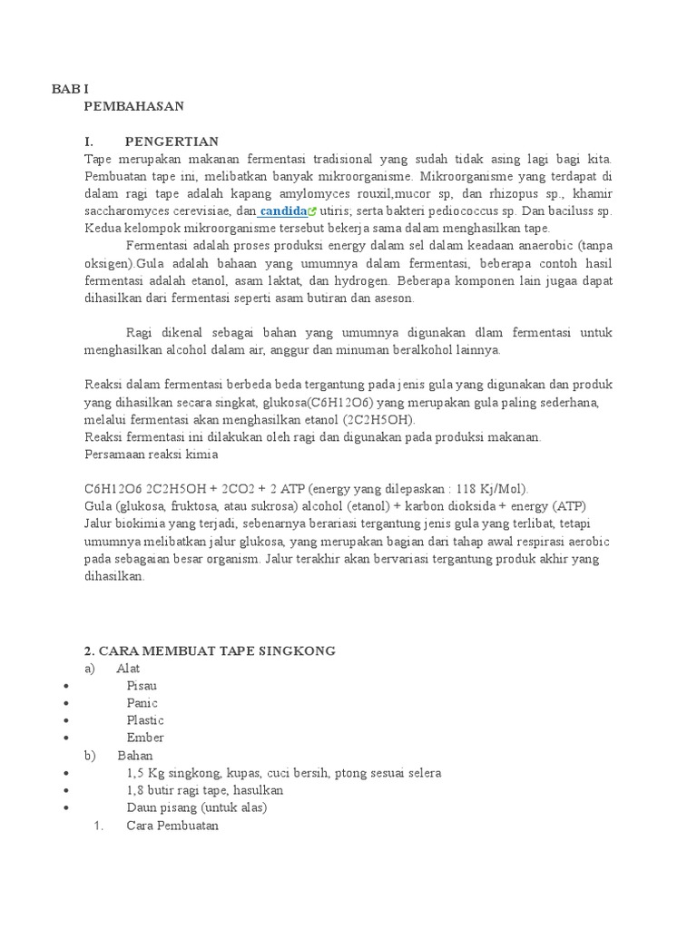 Pembuatan tape singkong melibatkan umbi singkong tersebut sebagai substrat dan ragi tape chlamydomucor saccharomyces cerevisiae dll yang dibalurkan pada umbi singkong yang telah dikupas kulitnya. Tape merupakan makanan fermentasi tradisional yang sudah tidak asing lagi. 1 1 1 1 latar belakang.