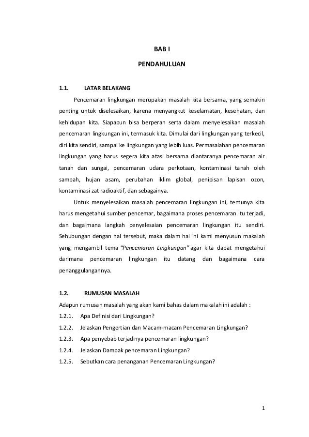 Makalah tentang pencemaran lingkungan. Mulai pemaparan masalah sampai memberikan solusi atas permasalahan pencemaran lingkungan yang terjadi dalam kehidupan manusia. 4 tahun 1982 yakni masuknya atau dimasukkannya mahluk hidup zat energi dan atau komponen lain ke dalam lingkungan. Adapun tujuan penulisan makalah ini adalah untuk memenuhi tugas bahasa indonesia di tahun ajaran 2014 dengan judul pencemaran lingkungan.