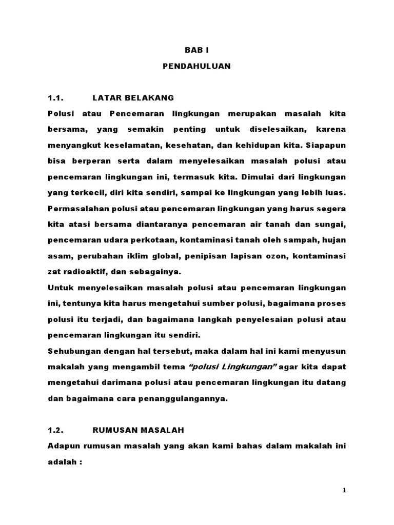 Bab i pendahuluan 1 1. Latar belakang pencemaran lingkungan merupakan masalah kita bersama yang semakin penting untuk diselesaikan karena menyangkut keselamatan kesehatan dan kehidupan kita. Pencemaran lingkungan ini perlu mendapat penanganan secara serius oleh semua pihak karena pencemaran lingkungan dapat menimbulkan gangguan terhadap kesejahteraan kesehatan bahkan dapat berakibat terhadap jiwa manusia.