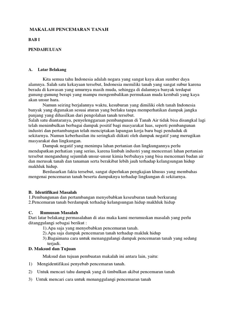 Makalah tentang pencemaran tanah. Pencemarana tanah berakibat terhadap kesehatan manusia tata kehidupan pertumbuhan flora dan fauna yang berada dalam jangkauan pencemaran karena tanah menghasilkan makanan bagi mahluk hidup. Untuk lebih memahami semua tentang pencemaran tanah disarankan para pembaca mencari referensi lain yang berkaitan dengan materi pada makalah ini. Makalah tentang pencemaran air.