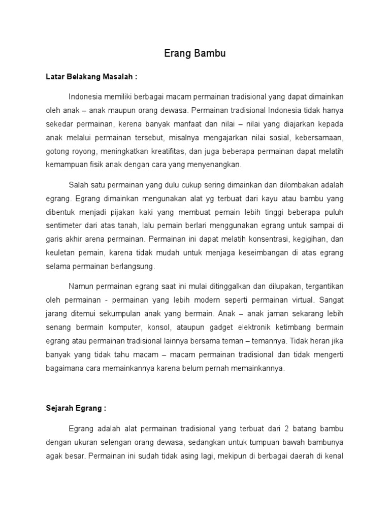Makalah tentang permainan tradisional egrang. Macam macam permainan tradisional indonesia adalah salah satu negara yang terkenal dengan akan kekayaan alam dan juga budayanya. Mengenal permainan tradisional bermain congklak egrang balap karung bola bekel dan lain lain di masa muda akan mengantarkan mereka pada permainan yang bermamfaat dalam kegiatan belajar untuk meraih prestasi di masa yang. Makalah tentang permainan tradisional bab i.