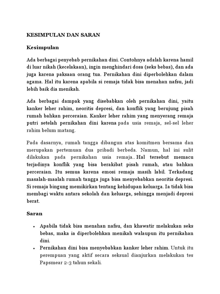 Sebagaimana kita ketahui bersama bahwa dampak dari pernikahan dini ini bisa berpengaruh ke berbagai aspek mulai dari aspek pendidikan kesehatan psikologis bahkan hingga ke kependudukan seperti kita ketahui bersama pernikahan dini yang dapat berpengaruh terhadap faktor. Tentang keabsahan hubungan antar suami istri maka saksilah yang berperan dalam menyelesaikannya. Academia edu is a platform for academics to share research papers.