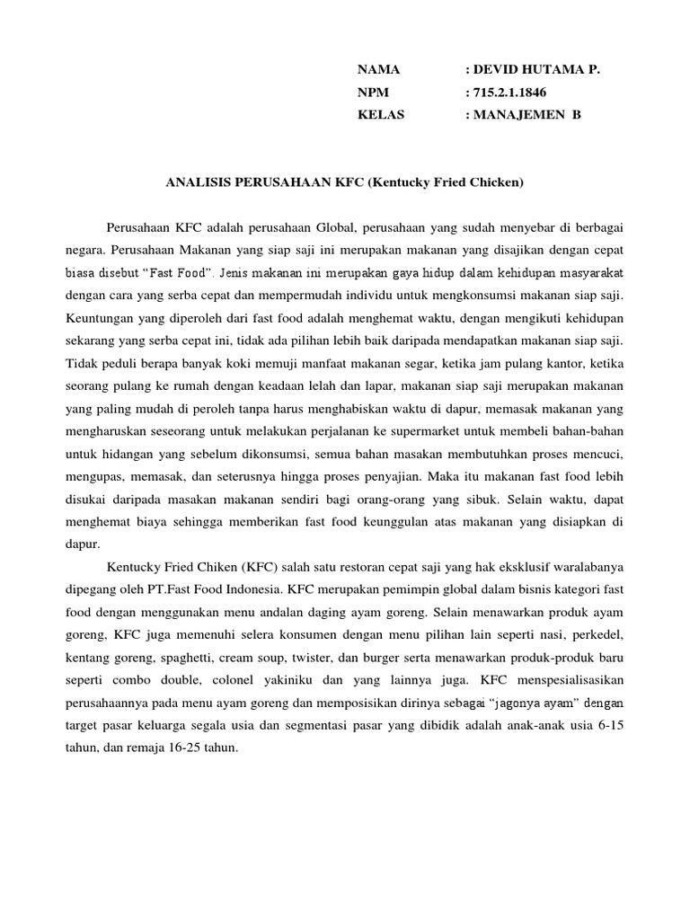 Makalah tentang perusahaan kfc. Makalah ini disusun dengan tujuan untuk memenuhi tugas mata kuliah sistem informasi manajemen yang diampu oleh septia lutfi s kom. Strategi pemasaran kfc disusun oleh. Kfc dan jingle perusahaan baru jari licinkan baik adalah pengumuman yang sering di televisi billboard brosur dan radio.