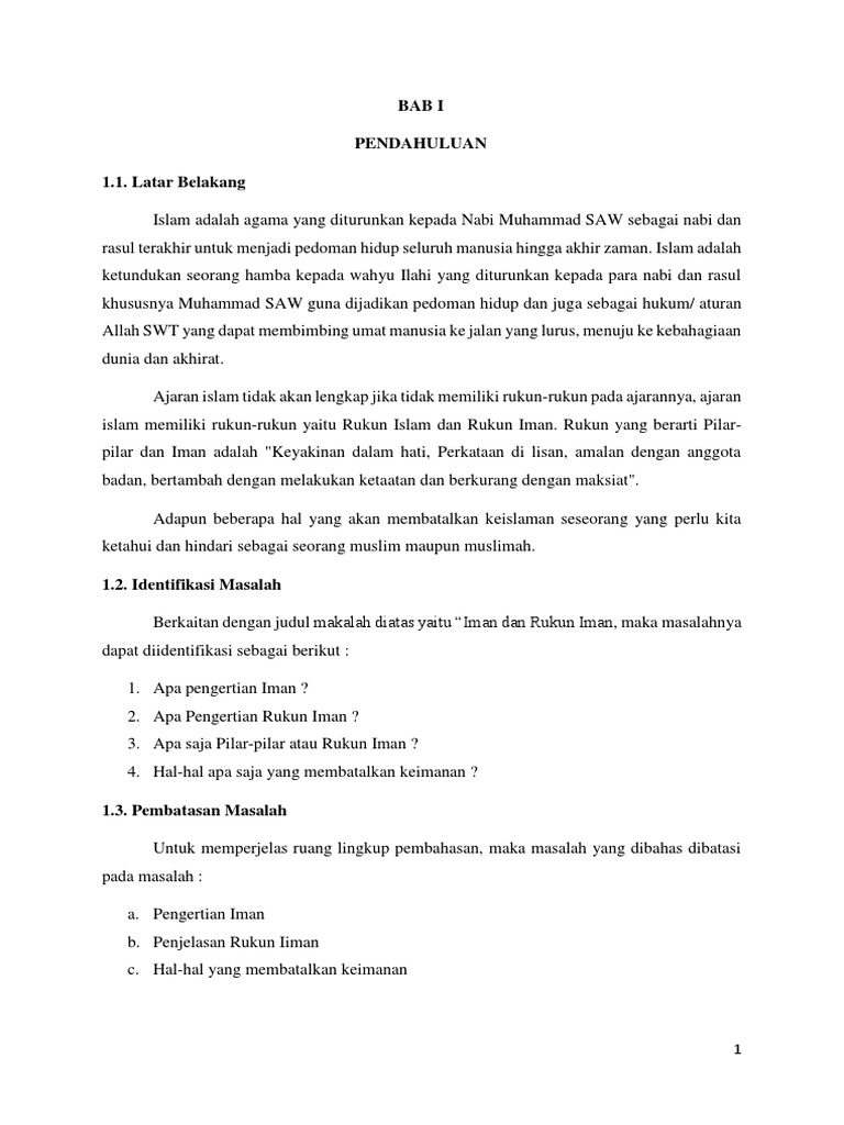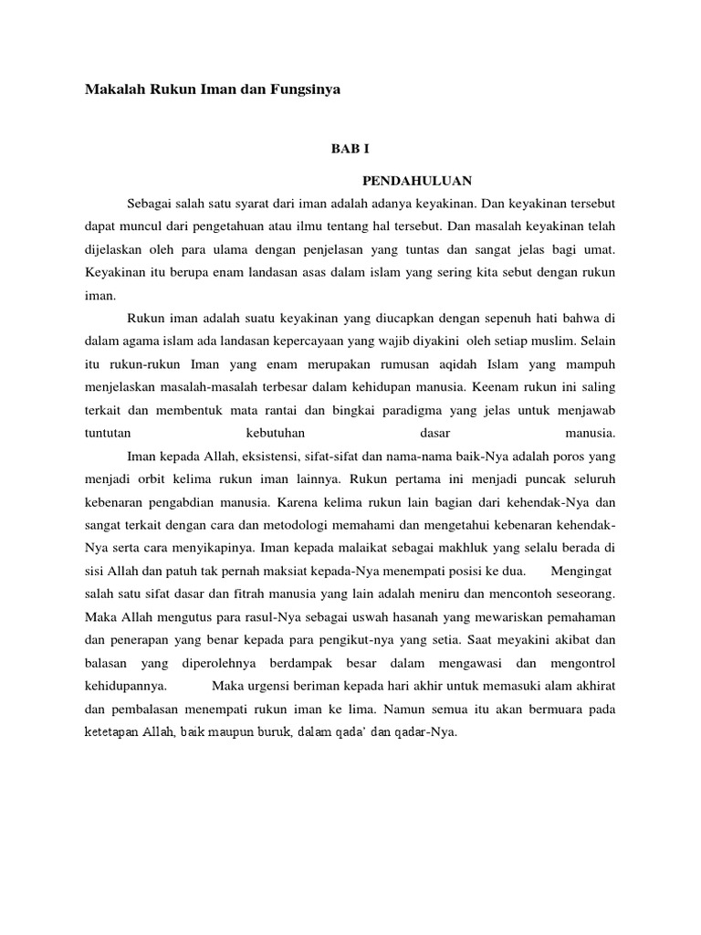 Makalah tentang rukun iman. Tujuan penulisan tujuan penyusunan makalah yang bertema tentang rukun iman ini adalah. 1 2 rumusan masalah berdasarkan latar belakang di atas maka berikut ini rumusan masalah yang akan dikaji dalam makalah ini yaitu. Rukun iman rukun iman merupakan pilar atau fondasi keimanan dari seorang yang beragama islam muslim apabila ia mempunyai serta mengamalkan rukun iman dalam segala aspek kehidupannya tentunya orang tersebut akan memiliki keimanan yang kuat.